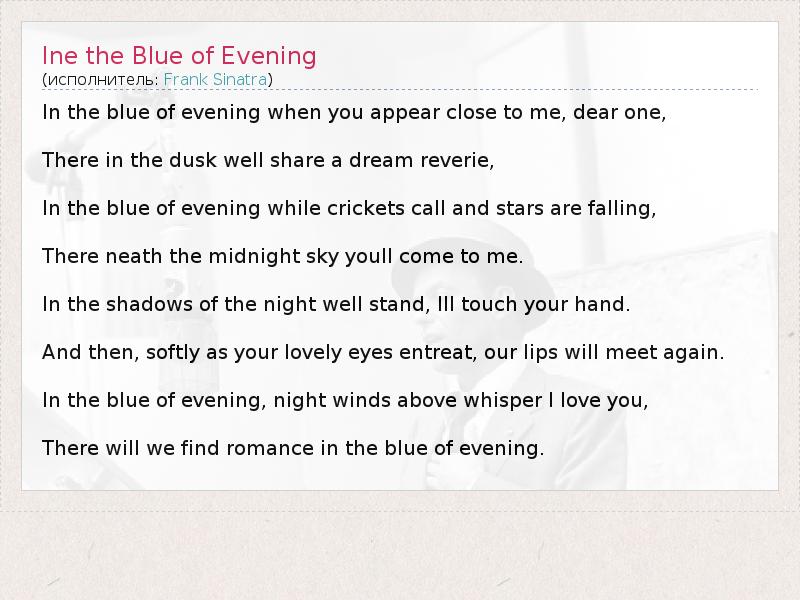 In the blue of evening when you appear close to me, dear one, There in the dusk well share a dream reverie, In the blue of evening while crickets call and stars are falling, There neath the midnight sky youll come to me. In the shadows of the night well stand, Ill touch your hand. And then, softly as your lovely eyes entreat, our lips will meet again. In the blue of evening, night winds above whisper I love you, There will we find romance in the blue of evening.