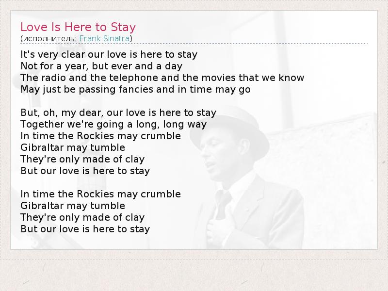 It's very clear our love is here to stay Not for a year, but ever and a day The radio and the telephone and the movies that we know May just be passing fancies and in time may go But, oh, my dear, our love is here to stay Together we're going a long, long way In time the Rockies may crumble Gibraltar may tumble They're only made of clay But our love is here to stay In time the Rockies may crumble Gibraltar may tumble They're only made of clay But our love is here to stay