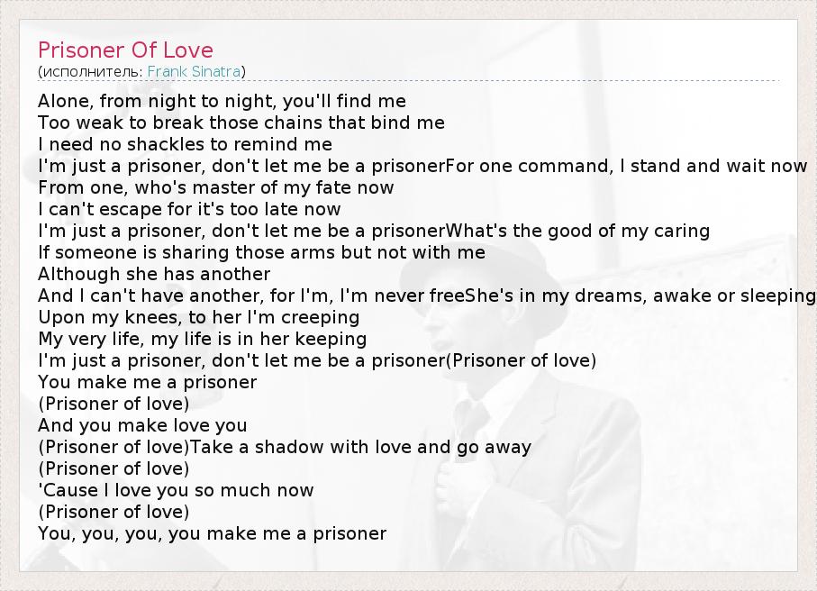 Alone, from night to night, you'll find me Too weak to break those chains that bind me I need no shackles to remind me I'm just a prisoner, don't let me be a prisonerFor one command, I stand and wait now From one, who's master of my fate now I can't escape for it's too late now I'm just a prisoner, don't let me be a prisonerWhat's the good of my caring If someone is sharing those arms but not with me Although she has another And I can't have another, for I'm, I'm never freeShe's in my dreams, awake or sleeping Upon my knees, to her I'm creeping My very life, my life is in her keeping I'm just a prisoner, don't let me be a prisoner(Prisoner of love) You make me a prisoner (Prisoner of love) And you make love you (Prisoner of love)Take a shadow with love and go away (Prisoner of love) 'Cause I love you so much now (Prisoner of love) You, you, you, you make me a prisoner