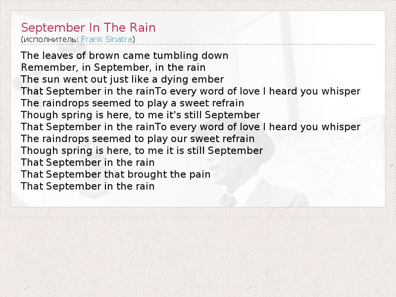 The leaves of brown came tumbling down Remember, in September, in the rain The sun went out just like a dying ember That September in the rainTo every word of love I heard you whisper The raindrops seemed to play a sweet refrain Though spring is here, to me it's still September That September in the rainTo every word of love I heard you whisper The raindrops seemed to play our sweet refrain Though spring is here, to me it is still September That September in the rain That September that brought the pain That September in the rain