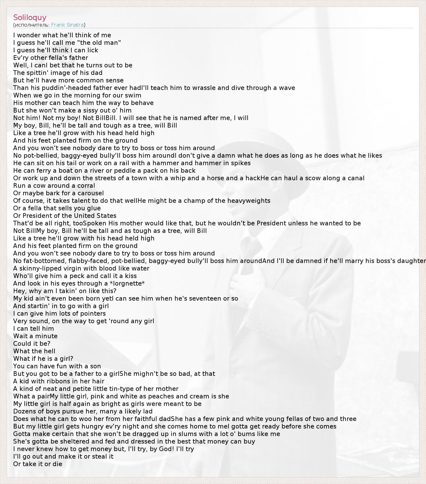 I wonder what he'll think of me I guess he'll call me "the old man" I guess he'll think I can lick Ev'ry other fella's father Well, I canI bet that he turns out to be The spittin' image of his dad But he'll have more common sense Than his puddin'-headed father ever hadI'll teach him to wrassle and dive through a wave When we go in the morning for our swim His mother can teach him the way to behave But she won't make a sissy out o' him Not him! Not my boy! Not BillBill. I will see that he is named after me, I will My boy, Bill, he'll be tall and tough as a tree, will Bill Like a tree he'll grow with his head held high And his feet planted firm on the ground And you won't see nobody dare to try to boss or toss him around No pot-bellied, baggy-eyed bully'll boss him aroundI don't give a damn what he does as long as he does what he likes He can sit on his tail or work on a rail with a hammer and hammer in spikes He can ferry a boat on a river or peddle a pack on his back Or work up and down the streets of a town with a whip and a horse and a hackHe can haul a scow along a canal Run a cow around a corral Or maybe bark for a carousel Of course, it takes talent to do that wellHe might be a champ of the heavyweights Or a fella that sells you glue Or President of the United States That'd be all right, tooSpoken His mother would like that, but he wouldn't be President unless he wanted to be Not BillMy boy, Bill he'll be tall and as tough as a tree, will Bill Like a tree he'll grow with his head held high And his feet planted firm on the ground And you won't see nobody dare to try to boss or toss him around No fat-bottomed, flabby-faced, pot-bellied, baggy-eyed bully'll boss him aroundAnd I'll be damned if he'll marry his boss's daughter A skinny-lipped virgin with blood like water Who'll give him a peck and call it a kiss And look in his eyes through a *lorgnette* Hey, why am I takin' on like this? My kid ain't even been born yetI can see him when he's seventeen or so And startin' in to go with a girl I can give him lots of pointers Very sound, on the way to get 'round any girl I can tell him Wait a minute Could it be? What the hell What if he is a girl? You can have fun with a son But you got to be a father to a girlShe mighn't be so bad, at that A kid with ribbons in her hair A kind of neat and petite little tin-type of her mother What a pairMy little girl, pink and white as peaches and cream is she My little girl is half again as bright as girls were meant to be Dozens of boys pursue her, many a likely lad Does what he can to woo her from her faithful dadShe has a few pink and white young fellas of two and three But my little girl gets hungry ev'ry night and she comes home to meI gotta get ready before she comes Gotta make certain that she won't be dragged up in slums with a lot o' bums like me She's gotta be sheltered and fed and dressed in the best that money can buy I never knew how to get money but, I'll try, by God! I'll try I'll go out and make it or steal it Or take it or die