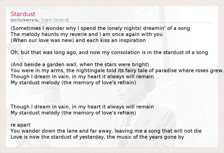 Oh, but that was long ago, and now my consolation is in the stardust of a song