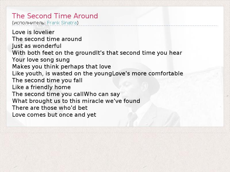 Love is lovelier The second time around Just as wonderful With both feet on the groundIt's that second time you hear Your love song sung Makes you think perhaps that love Like youth, is wasted on the youngLove's more comfortable The second time you fall Like a friendly home The second time you callWho can say What brought us to this miracle we've found There are those who'd bet Love comes but once and yet