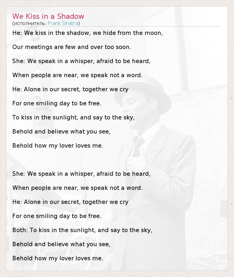 He: We kiss in the shadow, we hide from the moon, Our meetings are few and over too soon. She: We speak in a whisper, afraid to be heard, When people are near, we speak not a word. He: Alone in our secret, together we cry For one smiling day to be free. To kiss in the sunlight, and say to the sky, Behold and believe what you see, Behold how my lover loves me. She: We speak in a whisper, afraid to be heard, When people are near, we speak not a word. He: Alone in our secret, together we cry For one smiling day to be free. Both: To kiss in the sunlight, and say to the sky, Behold and believe what you see, Behold how my lover loves me.