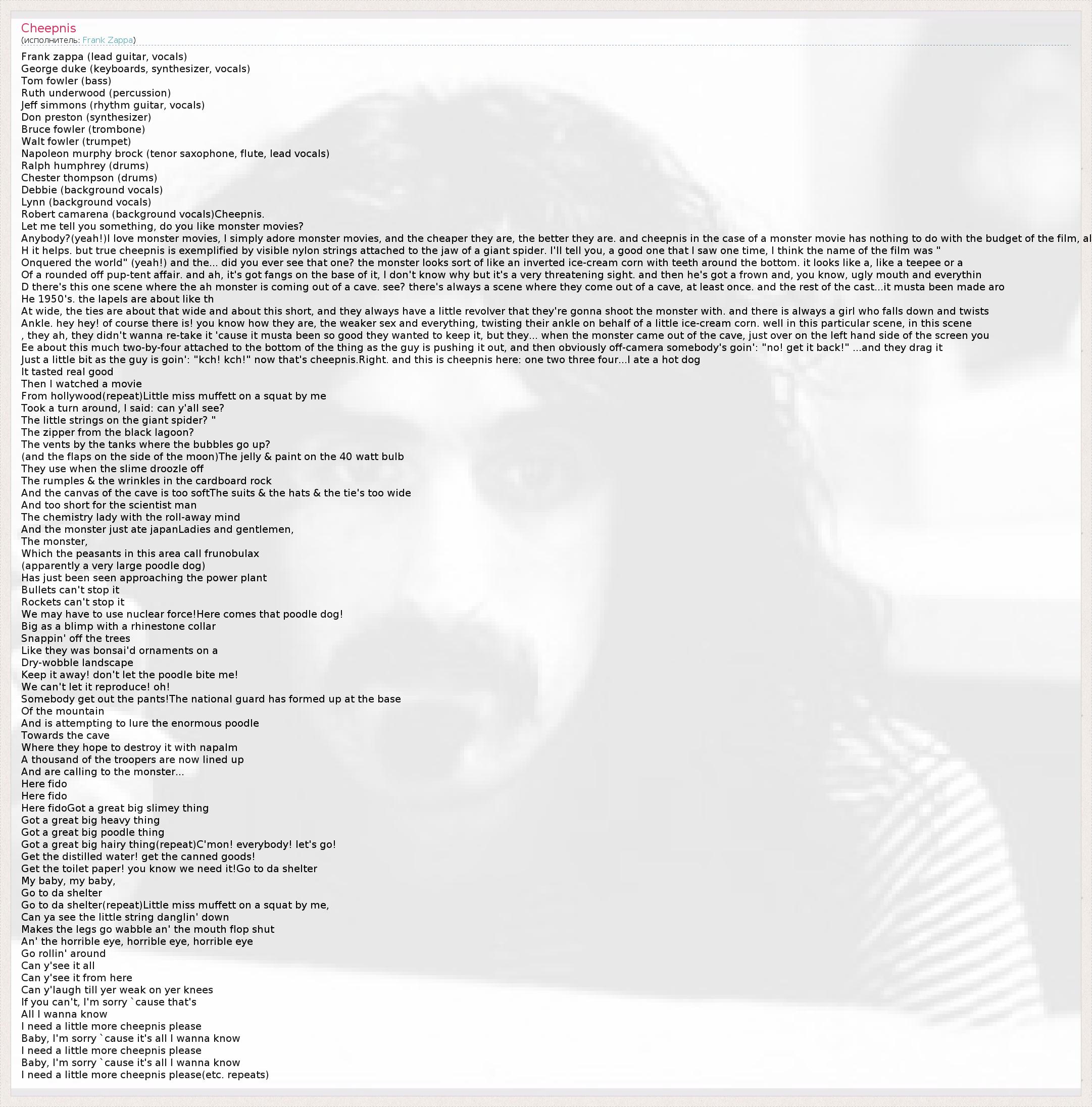 Это интересно:Фрэнк Винсент Заппа (англ. Frank Vincent Zappa, 21 декабря 1940 — 4 декабря 1993) — легендарный американский композитор, гитарист, певец, кинорежиссёр и сатирик. Был руководителем рок-группы The Mothers of Invention. Лауреат премии «Грэмми».За свою 33-летнюю музыкальную карьеру Заппа показал себя одним из самых плодовитых композиторов своей эпохи, выпустив более шестидесяти альбомов, почти все из... продолжение
