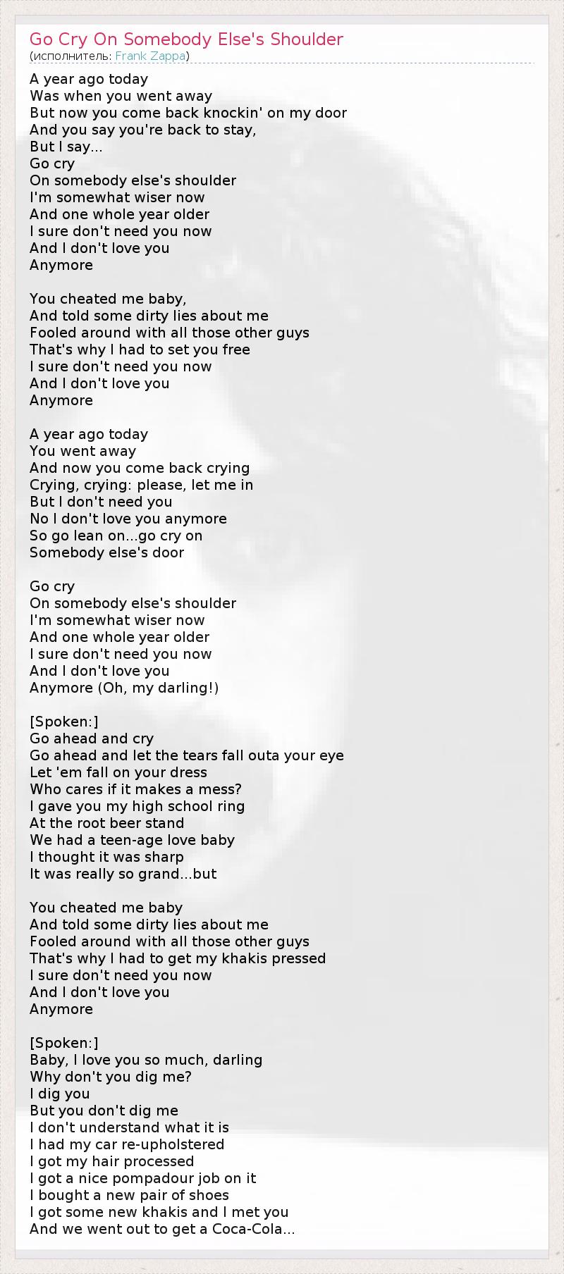ГлавнаяИсполнителиFrank ZappaGo Cry On Somebody Else's Shoulder
