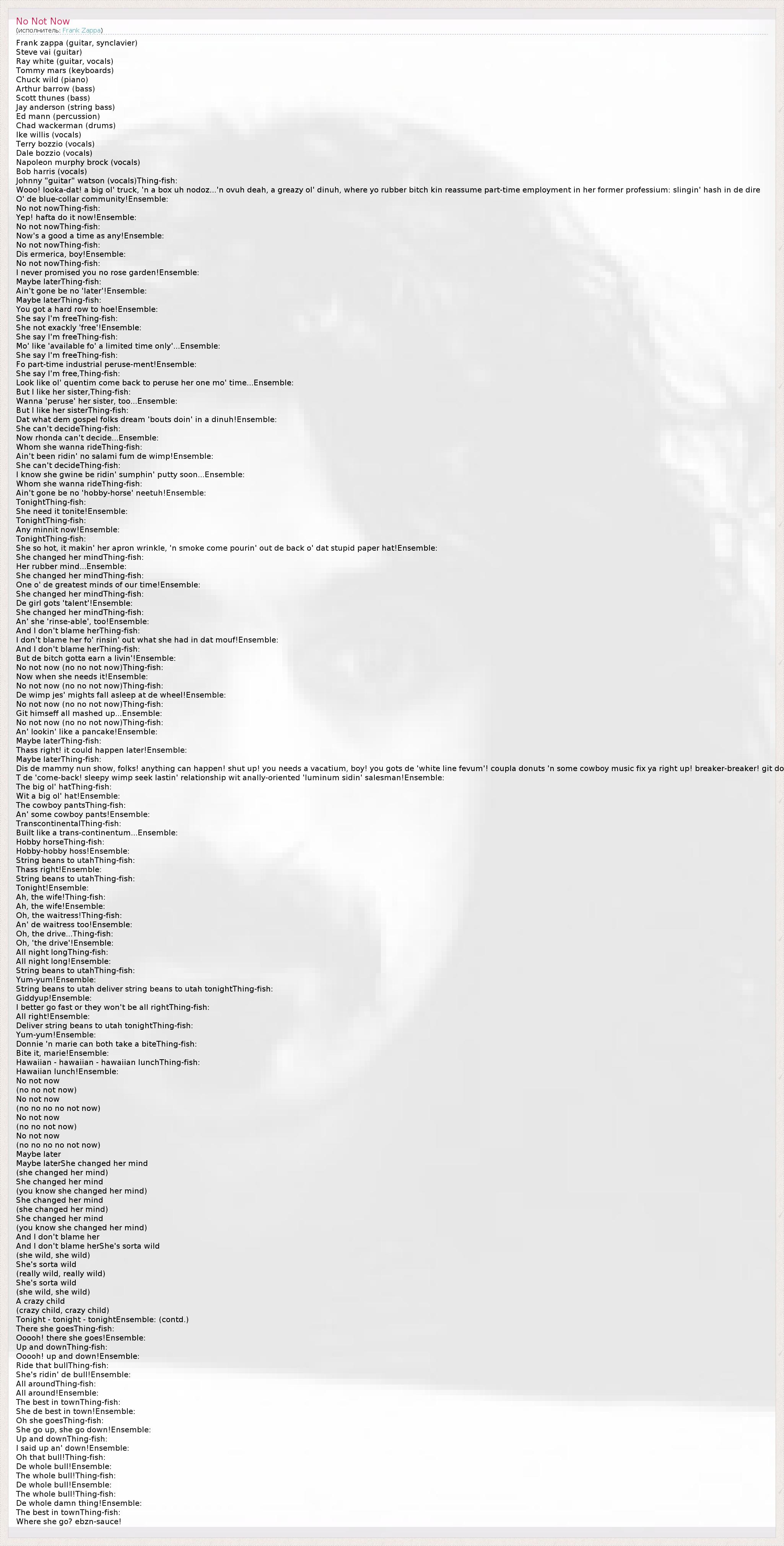 Frank zappa (guitar, synclavier) Steve vai (guitar) Ray white (guitar, vocals) Tommy mars (keyboards) Chuck wild (piano) Arthur barrow (bass) Scott thunes (bass) Jay anderson (string bass) Ed mann (percussion) Chad wackerman (drums) Ike willis (vocals) Terry bozzio (vocals) Dale bozzio (vocals) Napoleon murphy brock (vocals) Bob harris (vocals) Johnny "guitar" watson (vocals)Thing-fish: Wooo! looka-dat! a big ol' truck, 'n a box uh nodoz...'n ovuh deah, a greazy ol' dinuh, where yo rubber bitch kin reassume part-time employment in her former professium: slingin' hash in de dire O' de blue-collar community!Ensemble: No not nowThing-fish: Yep! hafta do it now!Ensemble: No not nowThing-fish: Now's a good a time as any!Ensemble: No not nowThing-fish: Dis ermerica, boy!Ensemble: No not nowThing-fish: I never promised you no rose garden!Ensemble: Maybe laterThing-fish: Ain't gone be no 'later'!Ensemble: Maybe laterThing-fish: You got a hard row to hoe!Ensemble: She say I'm freeThing-fish: She not exackly 'free'!Ensemble: She say I'm freeThing-fish: Mo' like 'available fo' a limited time only'...Ensemble: She say I'm freeThing-fish: Fo part-time industrial peruse-ment!Ensemble: She say I'm free,Thing-fish: Look like ol' quentim come back to peruse her one mo' time...Ensemble: But I like her sister,Thing-fish: Wanna 'peruse' her sister, too...Ensemble: But I like her sisterThing-fish: Dat what dem gospel folks dream 'bouts doin' in a dinuh!Ensemble: She can't decideThing-fish: Now rhonda can't decide...Ensemble: Whom she wanna rideThing-fish: Ain't been ridin' no salami fum de wimp!Ensemble: She can't decideThing-fish: I know she gwine be ridin' sumphin' putty soon...Ensemble: Whom she wanna rideThing-fish: Ain't gone be no 'hobby-horse' neetuh!Ensemble: TonightThing-fish: She need it tonite!Ensemble: TonightThing-fish: Any minnit now!Ensemble: TonightThing-fish: She so hot, it makin' her apron wrinkle, 'n smoke come pourin' out de back o' dat stupid paper hat!Ensemble: She changed her mindThing-fish: Her rubber mind...Ensemble: She changed her mindThing-fish: One o' de greatest minds of our time!Ensemble: She changed her mindThing-fish: De girl gots 'talent'!Ensemble: She changed her mindThing-fish: An' she 'rinse-able', too!Ensemble: And I don't blame herThing-fish: I don't blame her fo' rinsin' out what she had in dat mouf!Ensemble: And I don't blame herThing-fish: But de bitch gotta earn a livin'!Ensemble: No not now (no no not now)Thing-fish: Now when she needs it!Ensemble: No not now (no no not now)Thing-fish: De wimp jes' mights fall asleep at de wheel!Ensemble: No not now (no no not now)Thing-fish: Git himseff all mashed up...Ensemble: No not now (no no not now)Thing-fish: An' lookin' like a pancake!Ensemble: Maybe laterThing-fish: Thass right! it could happen later!Ensemble: Maybe laterThing-fish: Dis de mammy nun show, folks! anything can happen! shut up! you needs a vacatium, boy! you gots de 'white line fevum'! coupla donuts 'n some cowboy music fix ya right up! breaker-breaker! git do T de 'come-back! sleepy wimp seek lastin' relationship wit anally-oriented 'luminum sidin' salesman!Ensemble: The big ol' hatThing-fish: Wit a big ol' hat!Ensemble: The cowboy pantsThing-fish: An' some cowboy pants!Ensemble: TranscontinentalThing-fish: Built like a trans-continentum...Ensemble: Hobby horseThing-fish: Hobby-hobby hoss!Ensemble: String beans to utahThing-fish: Thass right!Ensemble: String beans to utahThing-fish: Tonight!Ensemble: Ah, the wife!Thing-fish: Ah, the wife!Ensemble: Oh, the waitress!Thing-fish: An' de waitress too!Ensemble: Oh, the drive...Thing-fish: Oh, 'the drive'!Ensemble: All night longThing-fish: All night long!Ensemble: String beans to utahThing-fish: Yum-yum!Ensemble: String beans to utah deliver string beans to utah tonightThing-fish: Giddyup!Ensemble: I better go fast or they won't be all rightThing-fish: All right!Ensemble: Deliver string beans to utah tonightThing-fish: Yum-yum!Ensemble: Donnie 'n marie can both take a biteThing-fish: Bite it, marie!Ensemble: Hawaiian - hawaiian - hawaiian lunchThing-fish: Hawaiian lunch!Ensemble: No not now (no no not now) No not now (no no no no not now) No not now (no no not now) No not now (no no no no not now) Maybe later Maybe laterShe changed her mind (she changed her mind) She changed her mind (you know she changed her mind) She changed her mind (she changed her mind) She changed her mind (you know she changed her mind) And I don't blame her And I don't blame herShe's sorta wild (she wild, she wild) She's sorta wild (really wild, really wild) She's sorta wild (she wild, she wild) A crazy child (crazy child, crazy child) Tonight - tonight - tonightEnsemble: (contd.) There she goesThing-fish: Ooooh! there she goes!Ensemble: Up and downThing-fish: Ooooh! up and down!Ensemble: Ride that bullThing-fish: She's ridin' de bull!Ensemble: All aroundThing-fish: All around!Ensemble: The best in townThing-fish: She de best in town!Ensemble: Oh she goesThing-fish: She go up, she go down!Ensemble: Up and downThing-fish: I said up an' down!Ensemble: Oh that bull!Thing-fish: De whole bull!Ensemble: The whole bull!Thing-fish: De whole bull!Ensemble: The whole bull!Thing-fish: De whole damn thing!Ensemble: The best in townThing-fish: Where she go? ebzn-sauce!