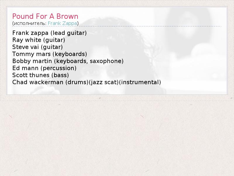 Это интересно:Фрэнк Винсент Заппа (англ. Frank Vincent Zappa, 21 декабря 1940 — 4 декабря 1993) — легендарный американский композитор, гитарист, певец, кинорежиссёр и сатирик. Был руководителем рок-группы The Mothers of Invention. Лауреат премии «Грэмми».За свою 33-летнюю музыкальную карьеру Заппа показал себя одним из самых плодовитых композиторов своей эпохи, выпустив более шестидесяти альбомов, почти все из... продолжение