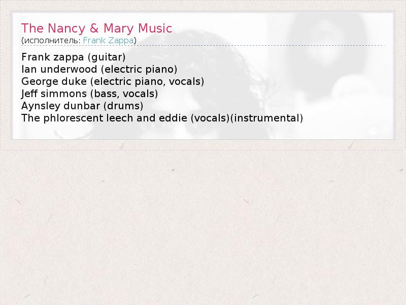Это интересно:Фрэнк Винсент Заппа (англ. Frank Vincent Zappa, 21 декабря 1940 — 4 декабря 1993) — легендарный американский композитор, гитарист, певец, кинорежиссёр и сатирик. Был руководителем рок-группы The Mothers of Invention. Лауреат премии «Грэмми».За свою 33-летнюю музыкальную карьеру Заппа показал себя одним из самых плодовитых композиторов своей эпохи, выпустив более шестидесяти альбомов, почти все из... продолжение