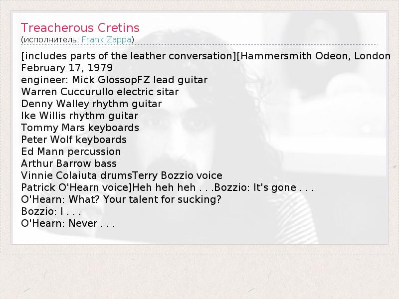 Это интересно:Фрэнк Винсент Заппа (англ. Frank Vincent Zappa, 21 декабря 1940 — 4 декабря 1993) — легендарный американский композитор, гитарист, певец, кинорежиссёр и сатирик. Был руководителем рок-группы The Mothers of Invention. Лауреат премии «Грэмми».За свою 33-летнюю музыкальную карьеру Заппа показал себя одним из самых плодовитых композиторов своей эпохи, выпустив более шестидесяти альбомов, почти все из... продолжение