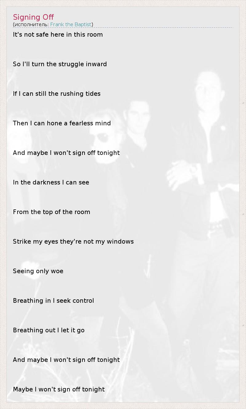It's not safe here in this room So I'll turn the struggle inward If I can still the rushing tides Then I can hone a fearless mind And maybe I won't sign off tonight In the darkness I can see From the top of the room Strike my eyes they're not my windows Seeing only woe Breathing in I seek control Breathing out I let it go And maybe I won't sign off tonight Maybe I won't sign off tonight