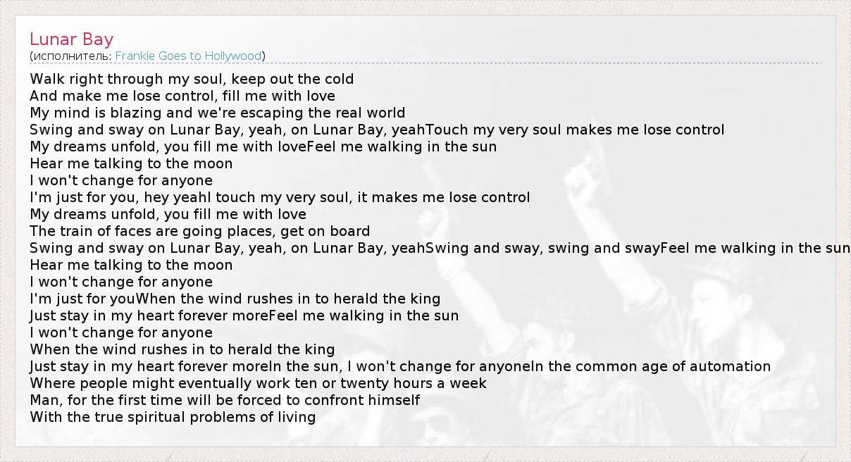 Walk right through my soul, keep out the cold And make me lose control, fill me with love My mind is blazing and we're escaping the real world Swing and sway on Lunar Bay, yeah, on Lunar Bay, yeahTouch my very soul makes me lose control My dreams unfold, you fill me with loveFeel me walking in the sun Hear me talking to the moon I won't change for anyone I'm just for you, hey yeahI touch my very soul, it makes me lose control My dreams unfold, you fill me with love The train of faces are going places, get on board Swing and sway on Lunar Bay, yeah, on Lunar Bay, yeahSwing and sway, swing and swayFeel me walking in the sun Hear me talking to the moon I won't change for anyone I'm just for youWhen the wind rushes in to herald the king Just stay in my heart forever moreFeel me walking in the sun I won't change for anyone When the wind rushes in to herald the king Just stay in my heart forever moreIn the sun, I won't change for anyoneIn the common age of automation Where people might eventually work ten or twenty hours a week Man, for the first time will be forced to confront himself With the true spiritual problems of living