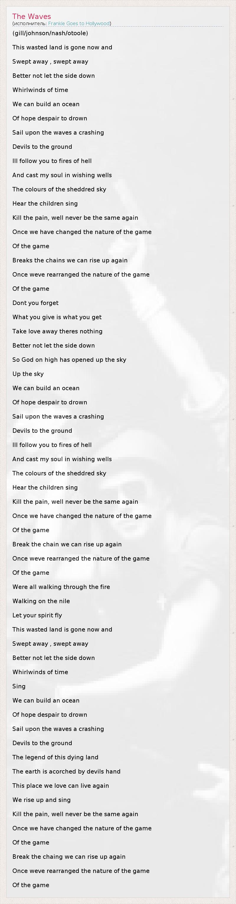 Это интересно:Английская электро-поп-группа, образована в Ливерпуле в 1981. Состав: Холли Джонсон (Holly Johnson) (р. 19 февраля 1960, Хартум, Судан) (вокал), Пол Разерфорд (Paul Rutherford) (вокал), Брайан Нэш (Brian Nash) (р. 20 июня 1963, Ливерпуль) (гитара), Марк О'Тулл (Mark O'Toole) (р. 6 января 1964, Ливерпуль) (бас-гитара), Питер Джилл (Peter Gill) (р. 8 марта 1964, Ливерпуль) (ударные).Музыканты придумали название, если верить их собственным... продолжение