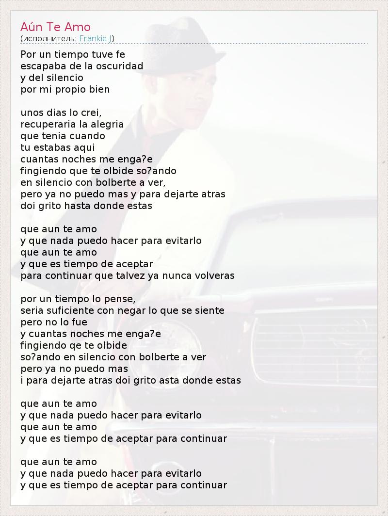 Por un tiempo tuve fe escapaba de la oscuridad y del silencio por mi propio bien unos dias lo crei, recuperaria la alegria que tenia cuando tu estabas aqui cuantas noches me enga?e fingiendo que te olbide so?ando en silencio con bolberte a ver, pero ya no puedo mas y para dejarte atras doi grito hasta donde estas que aun te amo y que nada puedo hacer para evitarlo que aun te amo y que es tiempo de aceptar para continuar que talvez ya nunca volveras por un tiempo lo pense, seria suficiente con negar lo que se siente pero no lo fue y cuantas noches me enga?e fingiendo qe te olbide so?ando en silencio con bolberte a ver pero ya no puedo mas i para dejarte atras doi grito asta donde estas que aun te amo y que nada puedo hacer para evitarlo que aun te amo y que es tiempo de aceptar para continuar que aun te amo y que nada puedo hacer para evitarlo y que es tiempo de aceptar para continuar