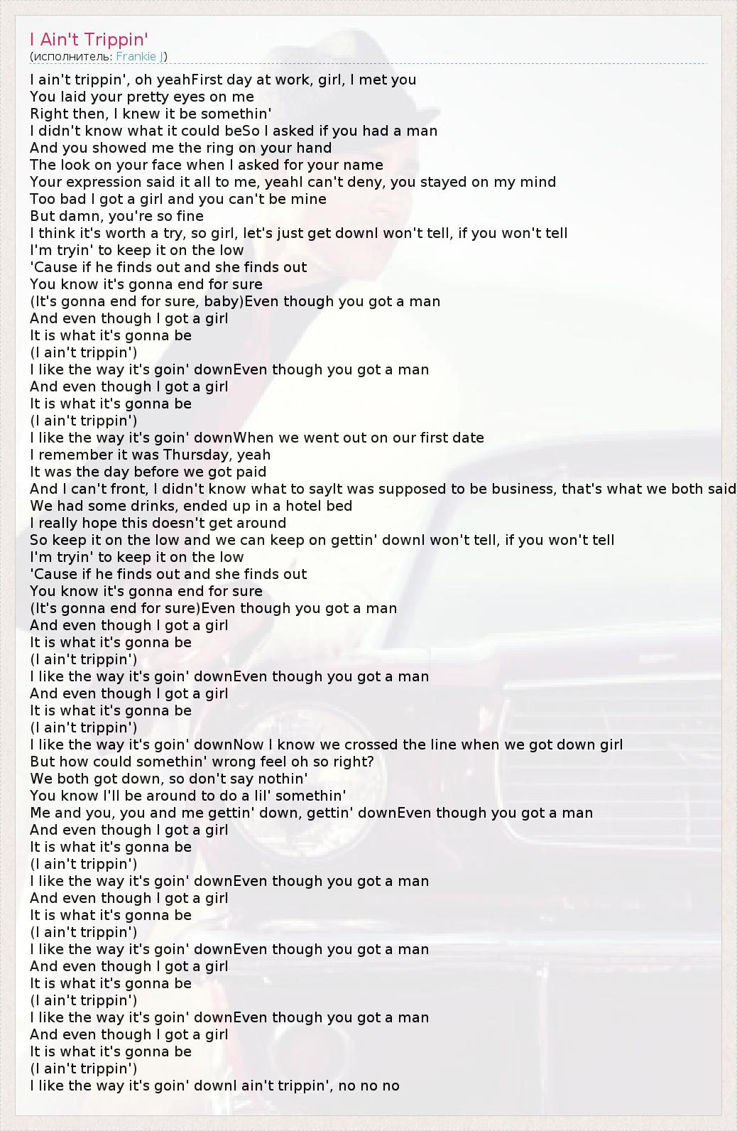I ain't trippin', oh yeahFirst day at work, girl, I met you You laid your pretty eyes on me Right then, I knew it be somethin' I didn't know what it could beSo I asked if you had a man And you showed me the ring on your hand The look on your face when I asked for your name Your expression said it all to me, yeahI can't deny, you stayed on my mind Too bad I got a girl and you can't be mine But damn, you're so fine I think it's worth a try, so girl, let's just get downI won't tell, if you won't tell I'm tryin' to keep it on the low 'Cause if he finds out and she finds out You know it's gonna end for sure (It's gonna end for sure, baby)Even though you got a man And even though I got a girl It is what it's gonna be (I ain't trippin') I like the way it's goin' downEven though you got a man And even though I got a girl It is what it's gonna be (I ain't trippin') I like the way it's goin' downWhen we went out on our first date I remember it was Thursday, yeah It was the day before we got paid And I can't front, I didn't know what to sayIt was supposed to be business, that's what we both said We had some drinks, ended up in a hotel bed I really hope this doesn't get around So keep it on the low and we can keep on gettin' downI won't tell, if you won't tell I'm tryin' to keep it on the low 'Cause if he finds out and she finds out You know it's gonna end for sure (It's gonna end for sure)Even though you got a man And even though I got a girl It is what it's gonna be (I ain't trippin') I like the way it's goin' downEven though you got a man And even though I got a girl It is what it's gonna be (I ain't trippin') I like the way it's goin' downNow I know we crossed the line when we got down girl But how could somethin' wrong feel oh so right? We both got down, so don't say nothin' You know I'll be around to do a lil' somethin' Me and you, you and me gettin' down, gettin' downEven though you got a man And even though I got a girl It is what it's gonna be (I ain't trippin') I like the way it's goin' downEven though you got a man And even though I got a girl It is what it's gonna be (I ain't trippin') I like the way it's goin' downEven though you got a man And even though I got a girl It is what it's gonna be (I ain't trippin') I like the way it's goin' downEven though you got a man And even though I got a girl It is what it's gonna be (I ain't trippin') I like the way it's goin' downI ain't trippin', no no no