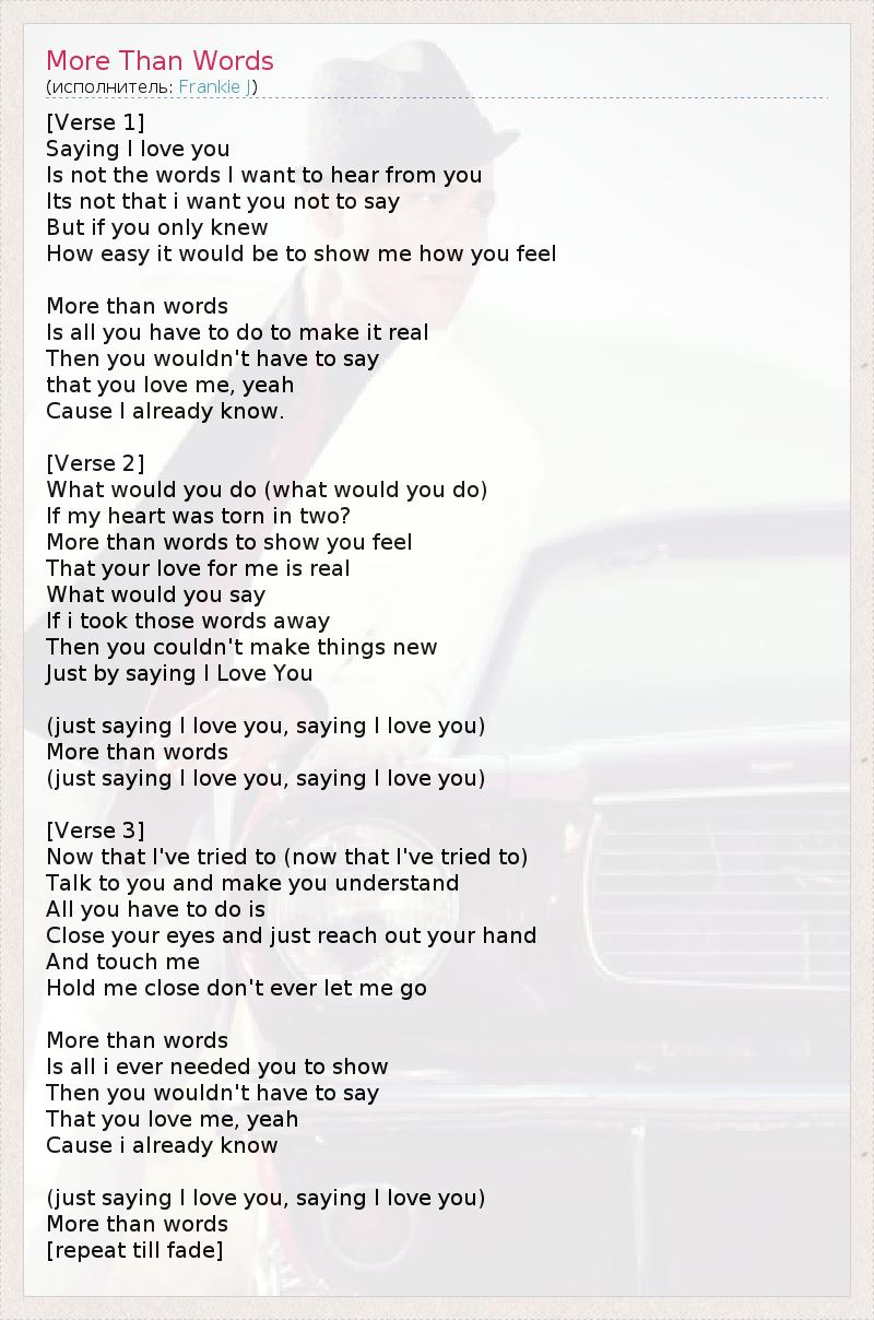 [Verse 1] Saying I love you Is not the words I want to hear from you Its not that i want you not to say But if you only knew How easy it would be to show me how you feel More than words Is all you have to do to make it real Then you wouldn't have to say that you love me, yeah Cause I already know. [Verse 2] What would you do (what would you do) If my heart was torn in two? More than words to show you feel That your love for me is real What would you say If i took those words away Then you couldn't make things new Just by saying I Love You (just saying I love you, saying I love you) More than words (just saying I love you, saying I love you) [Verse 3] Now that I've tried to (now that I've tried to) Talk to you and make you understand All you have to do is Close your eyes and just reach out your hand And touch me Hold me close don't ever let me go More than words Is all i ever needed you to show Then you wouldn't have to say That you love me, yeah Cause i already know (just saying I love you, saying I love you) More than words [repeat till fade]