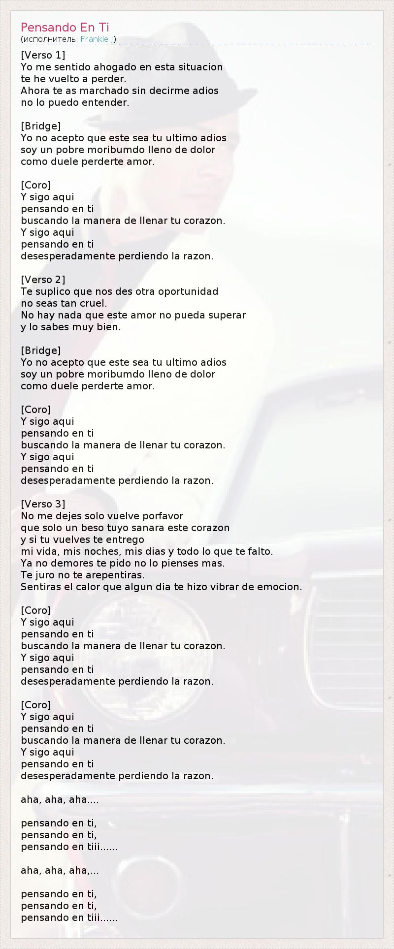 [Verso 1] Yo me sentido ahogado en esta situacion te he vuelto a perder. Ahora te as marchado sin decirme adios no lo puedo entender. [Bridge] Yo no acepto que este sea tu ultimo adios soy un pobre moribumdo lleno de dolor como duele perderte amor. [Coro] Y sigo aqui pensando en ti buscando la manera de llenar tu corazon. Y sigo aqui pensando en ti desesperadamente perdiendo la razon. [Verso 2] Te suplico que nos des otra oportunidad no seas tan cruel. No hay nada que este amor no pueda superar y lo sabes muy bien. [Bridge] Yo no acepto que este sea tu ultimo adios soy un pobre moribumdo lleno de dolor como duele perderte amor. [Coro] Y sigo aqui pensando en ti buscando la manera de llenar tu corazon. Y sigo aqui pensando en ti desesperadamente perdiendo la razon. [Verso 3] No me dejes solo vuelve porfavor que solo un beso tuyo sanara este corazon y si tu vuelves te entrego mi vida, mis noches, mis dias y todo lo que te falto. Ya no demores te pido no lo pienses mas. Te juro no te arepentiras. Sentiras el calor que algun dia te hizo vibrar de emocion. [Coro] Y sigo aqui pensando en ti buscando la manera de llenar tu corazon. Y sigo aqui pensando en ti desesperadamente perdiendo la razon. [Coro] Y sigo aqui pensando en ti buscando la manera de llenar tu corazon. Y sigo aqui pensando en ti desesperadamente perdiendo la razon. aha, aha, aha.... pensando en ti, pensando en ti, pensando en tiii...... aha, aha, aha,... pensando en ti, pensando en ti, pensando en tiii......