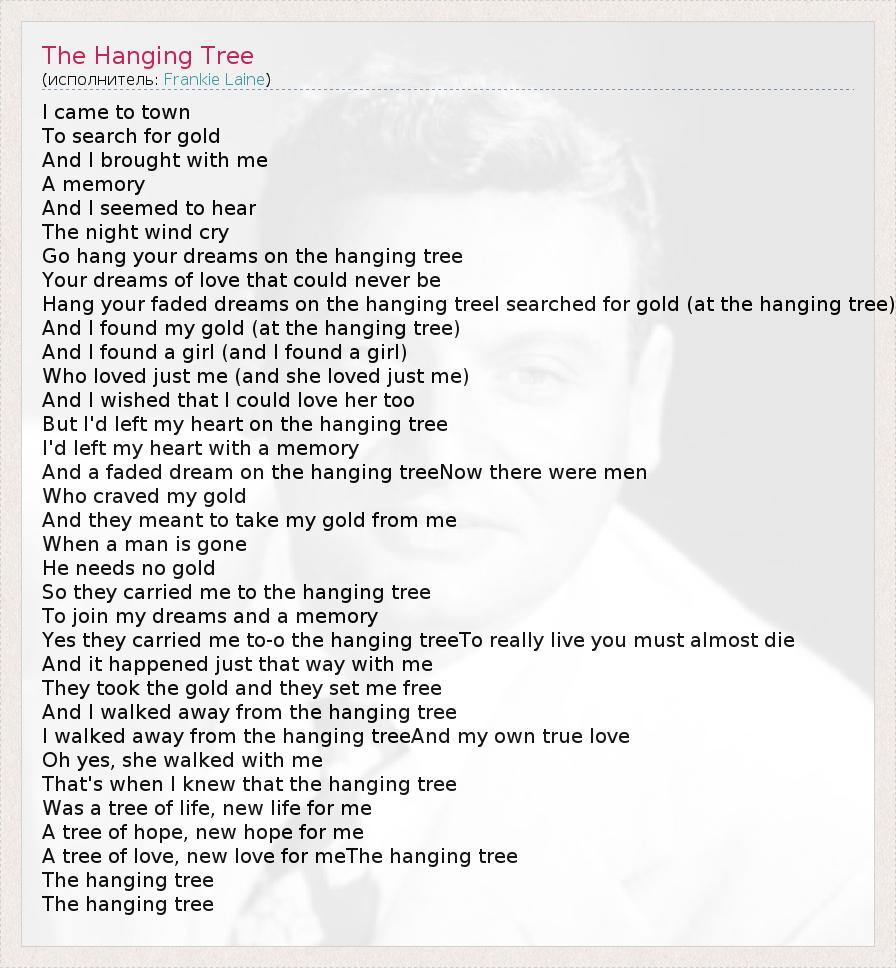 Hang your faded dreams on the hanging treeI searched for gold (at the hanging tree)