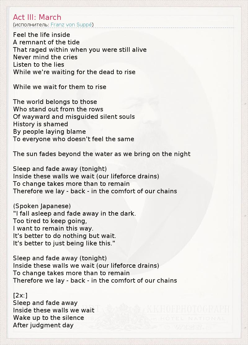 Feel the life inside A remnant of the tide That raged within when you were still alive Never mind the cries Listen to the lies While we're waiting for the dead to rise While we wait for them to rise The world belongs to those Who stand out from the rows Of wayward and misguided silent souls History is shamed By people laying blame To everyone who doesn't feel the same The sun fades beyond the water as we bring on the night Sleep and fade away (tonight) Inside these walls we wait (our lifeforce drains) To change takes more than to remain Therefore we lay - back - in the comfort of our chains (Spoken Japanese) "I fall asleep and fade away in the dark. Too tired to keep going, I want to remain this way. It's better to do nothing but wait. It's better to just being like this." Sleep and fade away (tonight) Inside these walls we wait (our lifeforce drains) To change takes more than to remain Therefore we lay - back - in the comfort of our chains [2x:] Sleep and fade away Inside these walls we wait Wake up to the silence After judgment day