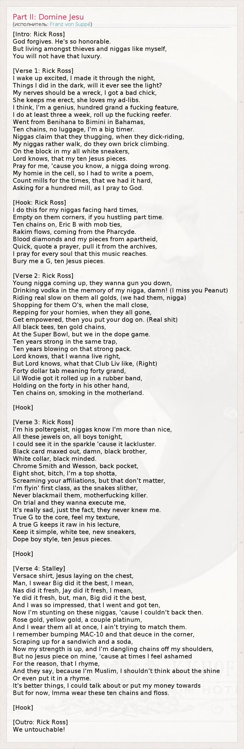 [Intro: Rick Ross] God forgives. He's so honorable. But living amongst thieves and niggas like myself, You will not have that luxury. [Verse 1: Rick Ross] I wake up excited, I made it through the night, Things I did in the dark, will it ever see the light? My nerves should be a wreck, I got a bad chick, She keeps me erect, she loves my ad-libs. I think, I'm a genius, hundred grand a fucking feature, I do at least three a week, roll up the fucking reefer. Went from Benihana to Bimini in Bahamas, Ten chains, no luggage, I'm a big timer. Niggas claim that they thugging, when they dick-riding, My niggas rather walk, do they own brick climbing. On the block in my all white sneakers, Lord knows, that my ten Jesus pieces. Pray for me, 'cause you know, a nigga doing wrong. My homie in the cell, so I had to write a poem, Count mills for the times, that we had it hard, Asking for a hundred mill, as I pray to God. [Hook: Rick Ross] I do this for my niggas facing hard times, Empty on them corners, if you hustling part time. Ten chains on, Eric B with mob ties, Rakim flows, coming from the Pharcyde. Blood diamonds and my pieces from apartheid, Quick, quote a prayer, pull it from the archives, I pray for every soul that this music reaches. Bury me a G, ten Jesus pieces. [Verse 2: Rick Ross] Young nigga coming up, they wanna gun you down, Drinking vodka in the memory of my nigga, damn! (I miss you Peanut) Riding real slow on them all golds, (we had them, nigga) Shopping for them O's, when the mall close, Repping for your homies, when they all gone, Get empowered, then you put your dog on. (Real shit) All black tees, ten gold chains, At the Super Bowl, but we in the dope game. Ten years strong in the same trap, Ten years blowing on that strong pack. Lord knows, that I wanna live right, But Lord knows, what that Club Liv like, (Right) Forty dollar tab meaning forty grand, Lil Wodie got it rolled up in a rubber band, Holding on the forty in his other hand, Ten chains on, smoking in the motherland. [Hook] [Verse 3: Rick Ross] I'm his poltergeist, niggas know I'm more than nice, All these jewels on, all boys tonight, I could see it in the sparkle 'cause it lackluster. Black card maxed out, damn, black brother, White collar, black minded. Chrome Smith and Wesson, back pocket, Eight shot, bitch, I'm a top shotta, Screaming your affiliations, but that don't matter, I'm flyin' first class, as the snakes slither, Never blackmail them, motherfucking killer. On trial and they wanna execute me, It's really sad, just the fact, they never knew me. True G to the core, feel my texture, A true G keeps it raw in his lecture, Keep it simple, white tee, new sneakers, Dope boy style, ten Jesus pieces. [Hook] [Verse 4: Stalley] Versace shirt, Jesus laying on the chest, Man, I swear Big did it the best, I mean, Nas did it fresh, Jay did it fresh, I mean, Ye did it fresh, but, man, Big did it the best, And I was so impressed, that I went and got ten, Now I'm stunting on these niggas, 'cause I couldn't back then. Rose gold, yellow gold, a couple platinum, And I wear them all at once, I ain't trying to match them. I remember bumping MAC-10 and that deuce in the corner, Scraping up for a sandwich and a soda, Now my strength is up, and I'm dangling chains off my shoulders, But no Jesus piece on mine, 'cause at times I feel ashamed For the reason, that I rhyme, And they say, because I'm Muslim, I shouldn't think about the shine Or even put it in a rhyme. It's better things, I could talk about or put my money towards But for now, Imma wear these ten chains and floss. [Hook] [Outro: Rick Ross] We untouchable!
