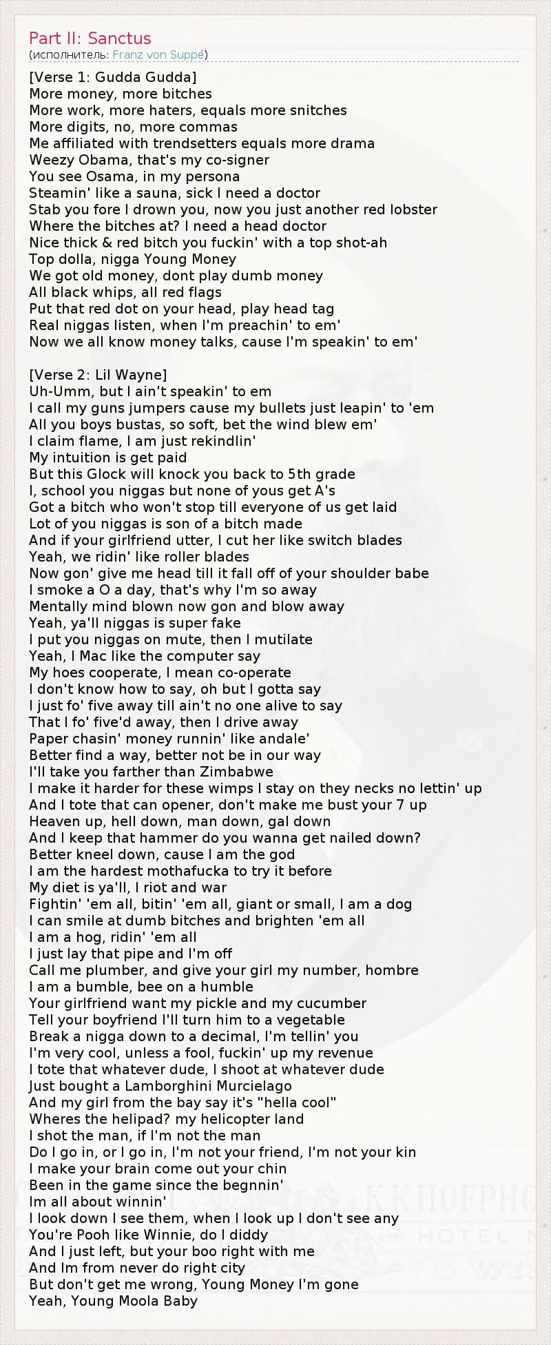 [Куплет 1: Gudda Gudda] Больше денег, больше с*чек, Больше работы, больше завистников, значит - больше стукачей, Больше цифр, нет - больше запятых, 1 Меня приняли законодатели, значит - больше трагедий, Weezy-Обама 2 - вот мой поручитель, Ты видишь Осаму в моем лице? Я испускаю пар как сауна, я болен, мне нужен врач, Заколю тебя, затем утоплю - вот ты и еще один красный лобстер, Где с*чки? Мне нужен головной врач 3 Стройная милашка и рыженькая - вы тр*хаетесь с гангстером, Я богач, нигер с Young Money, У нас - наследственные деньги, не играй в "глупые" деньги, Все тачки - черные, все флаги - красные, "Нарисую" красную точку у тебя на голове - сыграем в догонялки, Реальные нигеры слушают, когда я им проповедую, И мы знаем, что деньги умеют говорить, потому что я с ними разговариваю. [Куплет 2: Lil Wayne] Угу, но я не буду с ними болтать, Я называю свои пушки "прыгунами", 4 так как пули скачут к нигерам, Все вы, мальчишки - ублюдки, такие нежные, могу поспорить, вас сносит ветром, Я заявляю, что я - огонь, и я разгораюсь снова, Моя интуиция хорошо оплачивается, И моя пушка отправит вас обратно в пятый класс, Я займусь вашем обучением, но никто не получит пятёрку, У меня есть с*чка, которая не остановится, пока не переспит со всеми моими ребятами, Большинство из вас, нигеры - с*кины дети, И если твоя девчонка проговорится, я вырежу её - легко, как лезвием, Ага, мы несёмся как на роликах, А теперь, подруга, делай мне м*нет, пока у тебя не отвалится голова, Я выкуриваю по коробку в день, поэтому у меня такой отсутствующий вид, Мысленно выхожу из себя, возвращаюсь, и ухожу снова, Да, вы, нигеры - супер-фальшивки, Я заглушу вас, нигеров, а затем искалечу, Да, я - Мак, как компьютер, Мои шл*хи куперируются, а нет, я имею ввиду кооперируются, Я не знаю как сказать, но я должен сказать, Я откалибрую всех 45м, пока никого не останется в живых, Кого нужно откалибровать, затем уеду прочь, Охочусь за деньгами, а они убегают так, что Ой-ой-ёй, Лучше найди способ не быть у нас на пути, Не то отправлю тебя глубже, чем Зимбабве, Я сделаю так, чтобы этим слизнякам было потяжелее - сяду на шею и не отпущу, И я ношу с собой открывашку - не заставляй меня срывать твою крышку, Рай наверху, ад внизу, парень - на земле, девка – снизу, Держу при себе молоток - хочешь быть прибитым? Лучше приклонись на колени, потому что я - бог, Я самый жесткий ублюдок, кто когда либо делал это до настоящего момента, Моя диета - это вы, я бунтую и воюю, Дерусь со всеми, кусаю всех подряд, от мала до велика, я - псина, Я могу улыбнуться тупым с*чкам и затмить их, Я в клубе владельцев Харлеев, перееду их всех, Сейчас положу трубку 5 и отключусь, Называй меня "сантехник", и дай мой номер своей подруге, мачо 6 Я что-то все путаю, то ли пчела, то ли шмель 7 Твоя девушка хочет мой пикуль и мой огурчик, Скажи своему парню - я превращу его с овощ, Разобью нигера на дробь, я говорю тебе, Я очень хороший, если нигер не подпортит мой доход, Я переверну что угодно, парень, я выстрелю в любого парня, Только что купил Ламборгини Мурсьелаго, И моя подруга с залива 8 говорит, что она "чумовая", Где здесь вертолетная площадка? Мой вертолет приземлился, Я пристрелю чувака, если я "не мужик", Нападать или нет - я не твой друг, я не твой родственник, Я сделаю так, чтобы твой мозг вытек через подбородок, Я был в игре с самого её начала, И собираюсь только выигрывать, Я смотрю вниз и вижу их, а посмотрю вверх - не вижу ни