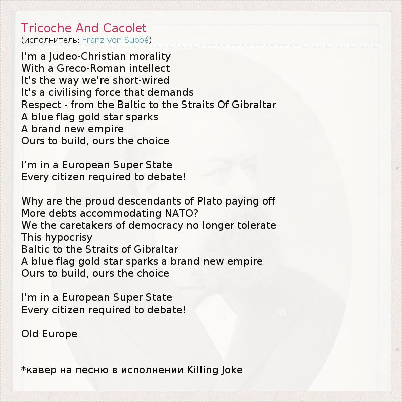 I'm a Judeo-Christian morality With a Greco-Roman intellect It's the way we're short-wired It's a civilising force that demands Respect - from the Baltic to the Straits Of Gibraltar A blue flag gold star sparks A brand new empire Ours to build, ours the choice I'm in a European Super State Every citizen required to debate! Why are the proud descendants of Plato paying off More debts accommodating NATO? We the caretakers of democracy no longer tolerate This hypocrisy Baltic to the Straits of Gibraltar A blue flag gold star sparks a brand new empire Ours to build, ours the choice I'm in a European Super State Every citizen required to debate! Old Europe *кавер на песню в исполнении Killing Joke