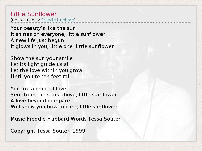 Your beauty's like the sun It shines on everyone, little sunflower A new life just begun It glows in you, little one, little sunflower Show the sun your smile Let its light guide us all Let the love within you grow Until you're ten feet tall You are a child of love Sent from the stars above, little sunflower A love beyond compare Will show you how to care, little sunflower Music Freddie Hubbard Words Tessa Souter Copyright Tessa Souter, 1999
