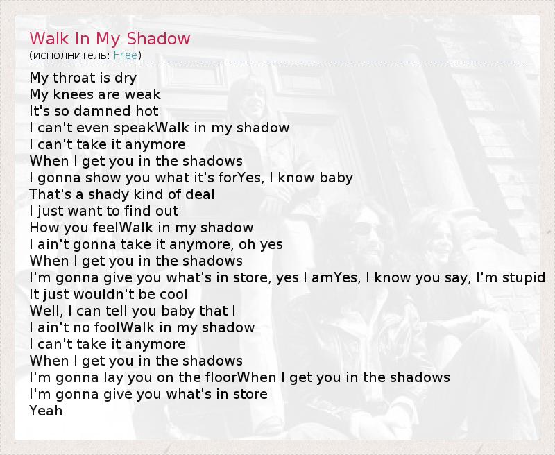 My throat is dry My knees are weak It's so damned hot I can't even speakWalk in my shadow I can't take it anymore When I get you in the shadows I gonna show you what it's forYes, I know baby That's a shady kind of deal I just want to find out How you feelWalk in my shadow I ain't gonna take it anymore, oh yes When I get you in the shadows I'm gonna give you what's in store, yes I amYes, I know you say, I'm stupid It just wouldn't be cool Well, I can tell you baby that I I ain't no foolWalk in my shadow I can't take it anymore When I get you in the shadows I'm gonna lay you on the floorWhen I get you in the shadows I'm gonna give you what's in store Yeah