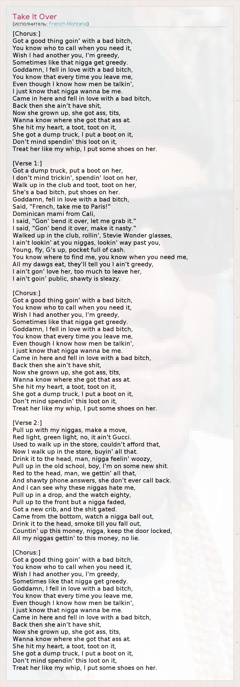 [Chorus:] Got a good thing goin' with a bad bitch, You know who to call when you need it, Wish I had another you, I'm greedy, Sometimes like that nigga get greedy. Goddamn, I fell in love with a bad bitch, You know that every time you leave me, Even though I know how men be talkin', I just know that nigga wanna be me. Came in here and fell in love with a bad bitch, Back then she ain't have shit, Now she grown up, she got ass, tits, Wanna know where she got that ass at. She hit my heart, a toot, toot on it, She got a dump truck, I put a boot on it, Don't mind spendin' this loot on it, Treat her like my whip, I put some shoes on her. [Verse 1:] Got a dump truck, put a boot on her, I don't mind trickin', spendin' loot on her, Walk up in the club and toot, toot on her, She's a bad bitch, put shoes on her. Goddamn, fell in love with a bad bitch, Said, "French, take me to Paris!" Dominican mami from Cali, I said, "Gon' bend it over, let me grab it." I said, "Gon' bend it over, make it nasty." Walked up in the club, rollin', Stevie Wonder glasses, I ain't lookin' at you niggas, lookin' way past you, Young, fly, G's up, pocket full of cash. You know where to find me, you know when you need me, All my dawgs eat, they'll tell you I ain't greedy, I ain't gon' love her, too much to leave her, I ain't goin' public, shawty is sleazy. [Chorus:] Got a good thing goin' with a bad bitch, You know who to call when you need it, Wish I had another you, I'm greedy, Sometimes like that nigga get greedy. Goddamn, I fell in love with a bad bitch, You know that every time you leave me, Even though I know how men be talkin', I just know that nigga wanna be me. Came in here and fell in love with a bad bitch, Back then she ain't have shit, Now she grown up, she got ass, tits, Wanna know where she got that ass at. She hit my heart, a toot, toot on it, She got a dump truck, I put a boot on it, Don't mind spendin' this loot on it, Treat her like my whip, I put some shoes on her. [Verse 2:] Pull up with my niggas, make a move, Red light, green light, no, it ain't Gucci. Used to walk up in the store, couldn't afford that, Now I walk up in the store, buyin' all that. Drink it to the head, man, nigga feelin' woozy, Pull up in the old school, boy, I'm on some new shit. Red to the head, man, we gettin' all that, And shawty phone answers, she don't ever call back. And I can see why these niggas hate me, Pull up in a drop, and the watch eighty, Pull up to the front but a nigga faded, Got a new crib, and the shit gated. Came from the bottom, watch a nigga ball out, Drink it to the head, smoke till you fall out, Countin' up this money, nigga, keep the door locked, All my niggas gettin' to this money, no lie. [Chorus:] Got a good thing goin' with a bad bitch, You know who to call when you need it, Wish I had another you, I'm greedy, Sometimes like that nigga get greedy. Goddamn, I fell in love with a bad bitch, You know that every time you leave me, Even though I know how men be talkin', I just know that nigga wanna be me. Came in here and fell in love with a bad bitch, Back then she ain't have shit, Now she grown up, she got ass, tits, Wanna know where she got that ass at. She hit my heart, a toot, toot on it, She got a dump truck, I put a boot on it, Don't mind spendin' this loot on it, Treat her like my whip, I put some shoes on her.