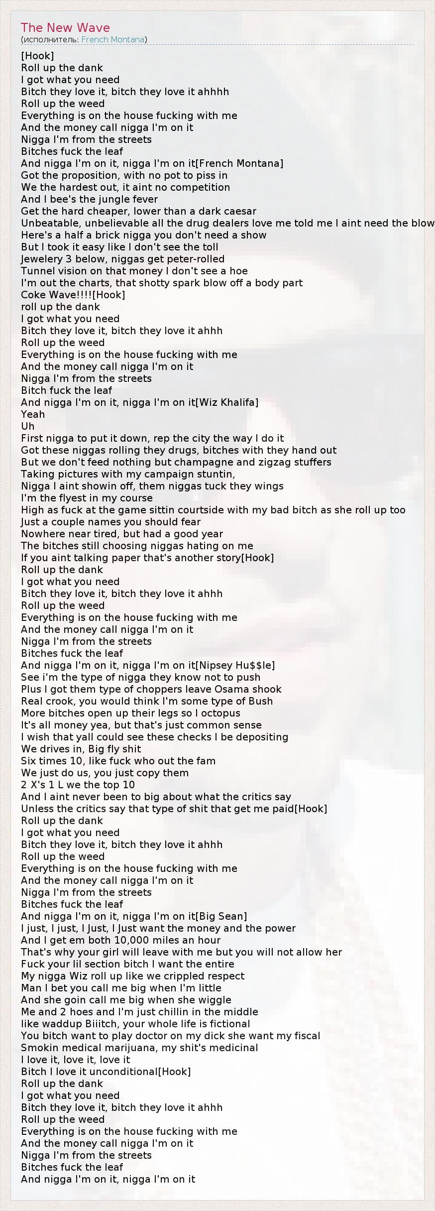 [Hook] Roll up the dank I got what you need Bitch they love it, bitch they love it ahhhh Roll up the weed Everything is on the house fucking with me And the money call nigga I'm on it Nigga I'm from the streets Bitches fuck the leaf And nigga I'm on it, nigga I'm on it[French Montana] Got the proposition, with no pot to piss in We the hardest out, it aint no competition And I bee's the jungle fever Get the hard cheaper, lower than a dark caesar Unbeatable, unbelievable all the drug dealers love me told me I aint need the blow Here's a half a brick nigga you don't need a show But I took it easy like I don't see the toll Jewelery 3 below, niggas get peter-rolled Tunnel vision on that money I don't see a hoe I'm out the charts, that shotty spark blow off a body part Coke Wave!!!![Hook] roll up the dank I got what you need Bitch they love it, bitch they love it ahhh Roll up the weed Everything is on the house fucking with me And the money call nigga I'm on it Nigga I'm from the streets Bitch fuck the leaf And nigga I'm on it, nigga I'm on it[Wiz Khalifa] Yeah Uh First nigga to put it down, rep the city the way I do it Got these niggas rolling they drugs, bitches with they hand out But we don't feed nothing but champagne and zigzag stuffers Taking pictures with my campaign stuntin, Nigga I aint showin off, them niggas tuck they wings I'm the flyest in my course High as fuck at the game sittin courtside with my bad bitch as she roll up too Just a couple names you should fear Nowhere near tired, but had a good year The bitches still choosing niggas hating on me If you aint talking paper that's another story[Hook] Roll up the dank I got what you need Bitch they love it, bitch they love it ahhh Roll up the weed Everything is on the house fucking with me And the money call nigga I'm on it Nigga I'm from the streets Bitches fuck the leaf And nigga I'm on it, nigga I'm on it[Nipsey Hu$$le] See i'm the type of nigga they know not to push Plus I got them type of choppers leave Osama shook Real crook, you would think I'm some type of Bush More bitches open up their legs so I octopus It's all money yea, but that's just common sense I wish that yall could see these checks I be depositing We drives in, Big fly shit Six times 10, like fuck who out the fam We just do us, you just copy them 2 X's 1 L we the top 10 And I aint never been to big about what the critics say Unless the critics say that type of shit that get me paid[Hook] Roll up the dank I got what you need Bitch they love it, bitch they love it ahhh Roll up the weed Everything is on the house fucking with me And the money call nigga I'm on it Nigga I'm from the streets Bitches fuck the leaf And nigga I'm on it, nigga I'm on it[Big Sean] I just, I just, I Just, I Just want the money and the power And I get em both 10,000 miles an hour That's why your girl will leave with me but you will not allow her Fuck your lil section bitch I want the entire My nigga Wiz roll up like we crippled respect Man I bet you call me big when I'm little And she goin call me big when she wiggle Me and 2 hoes and I'm just chillin in the middle like waddup Biiitch, your whole life is fictional You bitch want to play doctor on my dick she want my fiscal Smokin medical marijuana, my shit's medicinal I love it, love it, love it Bitch I love it unconditional[Hook] Roll up the dank I got what you need Bitch they love it, bitch they love it ahhh Roll up the weed Everything is on the house fucking with me And the money call nigga I'm on it Nigga I'm from the streets Bitches fuck the leaf And nigga I'm on it, nigga I'm on it