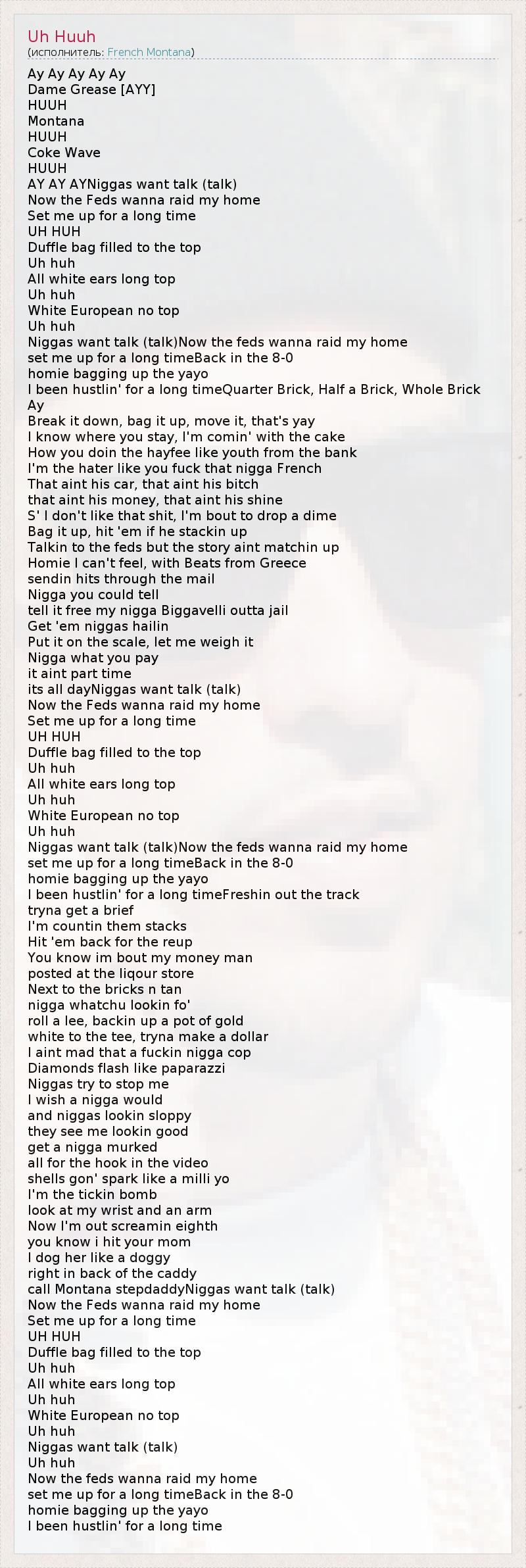 Это интересно:Karim Kharbouch (born November 9, 1984) better known by his stage name French Montana, is an American rapper born in Morocco.He is the founder and CEO of Cocaine City Records. In 2012, he signed a joint venture recording deal with Maybach Music Group and Bad Boy Records. Montana is known for his frequent collaborations with Max B, and more recently with Rick Ross along with his group Coke Boys, which consists of rappers Chinx Drugz, Cheeze and Flip.His debut album Excuse My French is scheduled to be released on May 21, 2013.Contents 1 Early life2 Music career2.1 2002–2011: Cocaine City Records2.2 2011–present: Bad Boy Records; Maybach Music Group; debut album... продолжение