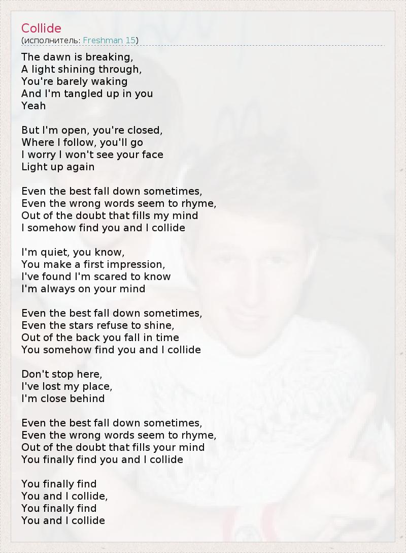 Рассвет близится, Свет проникает внутрь, Ты едва просыпаешься, И я запутываюсь в тебе, Да Но я открыт, а ты закрыта, Куда бы ты ни пошла, я следую за тобой, Я обеспокоен, что я не увижу твоего Освещенного лица снова Даже лучшие иногда падают, Даже неправильные слова иногда рифмуются, Сомнение наполняет мои мысли, но однажды Ты и я, мы столкнемся Я спокоен, ты знаешь, Ты производишь первое впечатление, Я понял, что боюсь узнать, Что я всегда в твоих мыслях Даже лучшие иногда падают, Даже звезды отказываются светить, Хоть ты порою и падаешь, но однажды Ты и я, мы столкнемся Не останавливайся здесь, Я потерялся, Я совсем рядом, позади тебя Даже лучшие иногда падают, Даже неправильные слова иногда рифмуются, Сомнение наполняет твои мысли, но однажды Ты и я, увидишь, мы столкнемся Ты увидишь, Ты и я, мы столкнемся, Ты увидишь, Ты и я, мы столкнемся