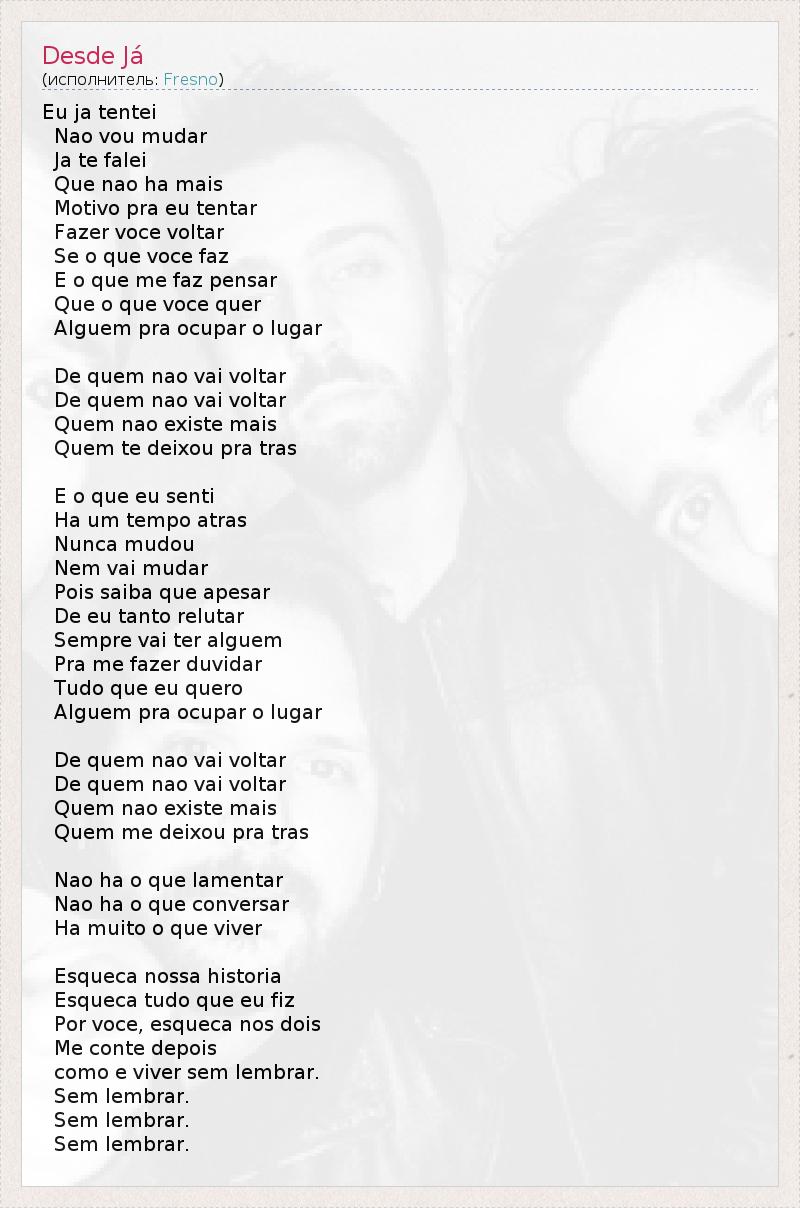 Это интересно:Fresno является бразильской рок-группой, образованной в Порту-Алегри в конце 1999 года. В настоящее время состав группы такой: Лукас Сильвейра (вокал, ритм-гитара, клавишные), Густаво Мантовани (соло-гитара), Белл Рашель (барабаны) и Марио Камело (клавишные). У них уже есть пять альбомов, последний из которых - "Revanche". Лукас, Густаво, Леандро Перэйра и Педро Купертино (первый состав коллектива)... продолжение