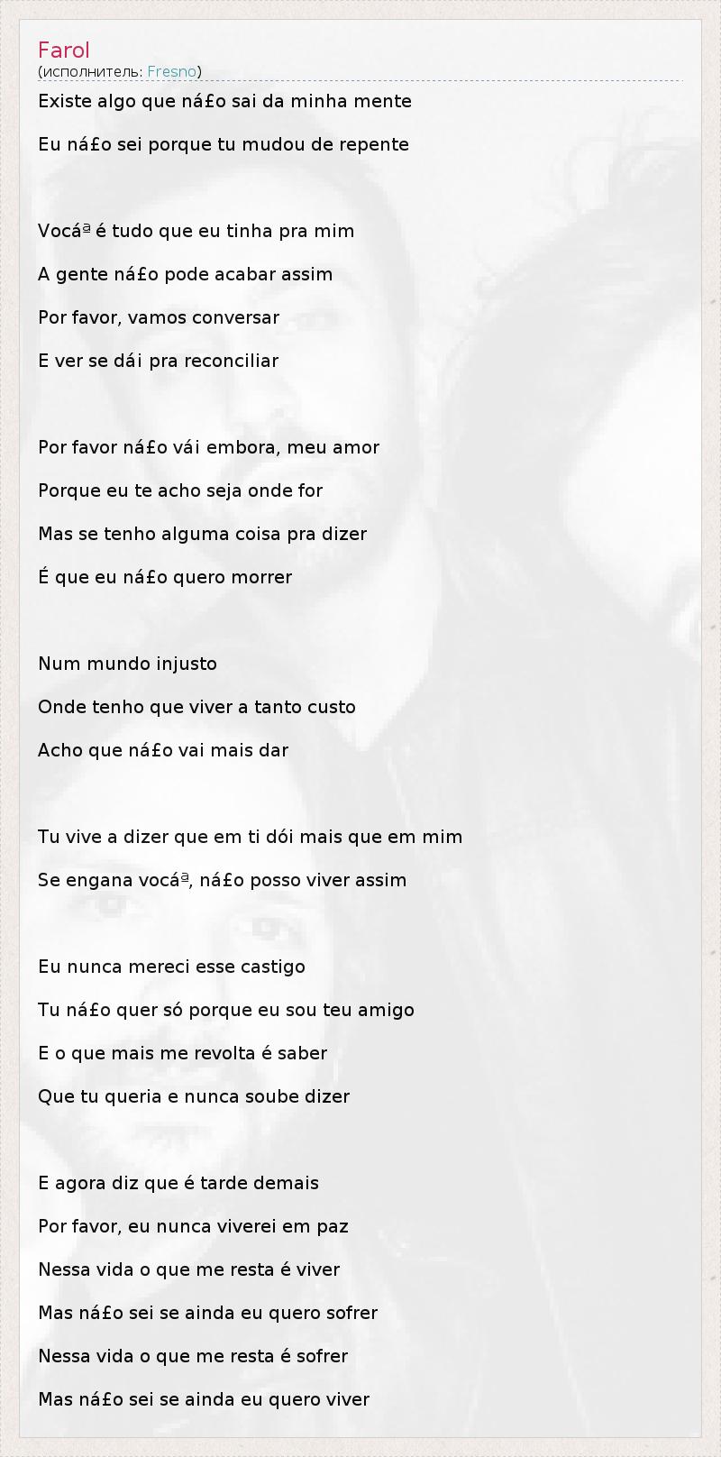 Это интересно:Fresno является бразильской рок-группой, образованной в Порту-Алегри в конце 1999 года. В настоящее время состав группы такой: Лукас Сильвейра (вокал, ритм-гитара, клавишные), Густаво Мантовани (соло-гитара), Белл Рашель (барабаны) и Марио Камело (клавишные). У них уже есть пять альбомов, последний из которых - "Revanche". Лукас, Густаво, Леандро Перэйра и Педро Купертино (первый состав коллектива)... продолжение