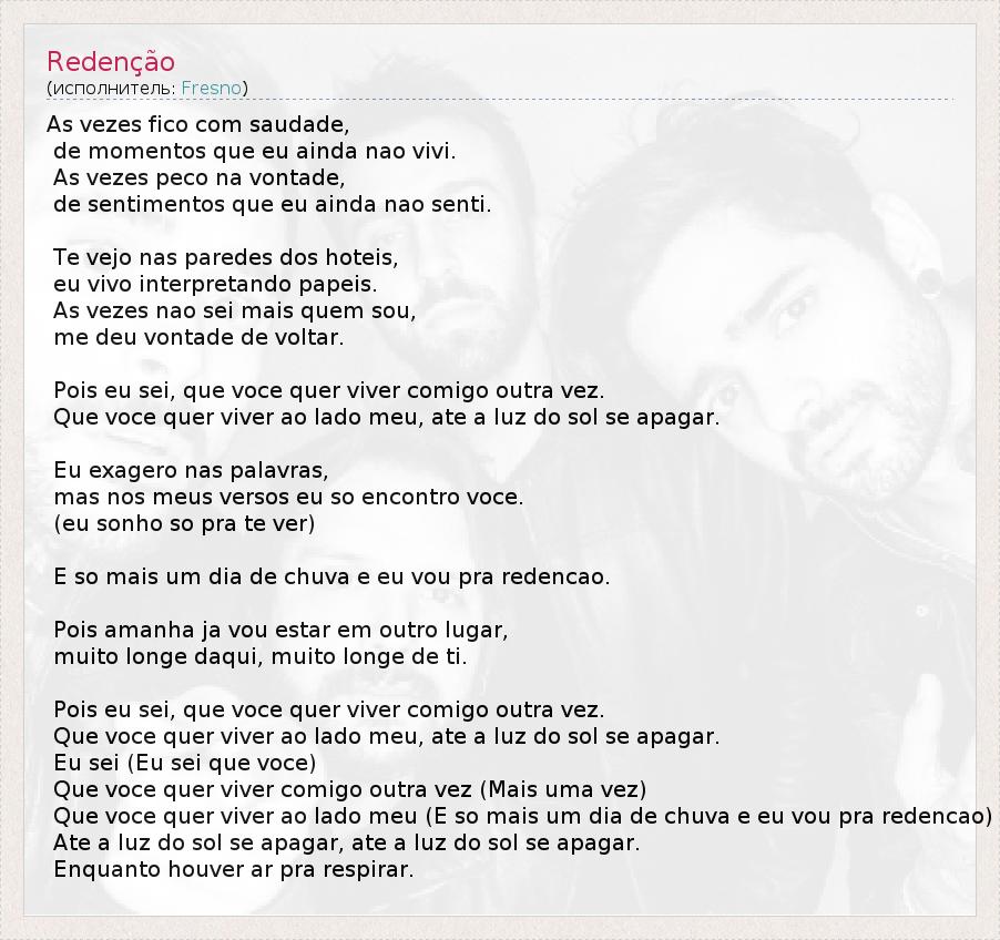 Это интересно:Fresno является бразильской рок-группой, образованной в Порту-Алегри в конце 1999 года. В настоящее время состав группы такой: Лукас Сильвейра (вокал, ритм-гитара, клавишные), Густаво Мантовани (соло-гитара), Белл Рашель (барабаны) и Марио Камело (клавишные). У них уже есть пять альбомов, последний из которых - "Revanche". Лукас, Густаво, Леандро Перэйра и Педро Купертино (первый состав коллектива)... продолжение