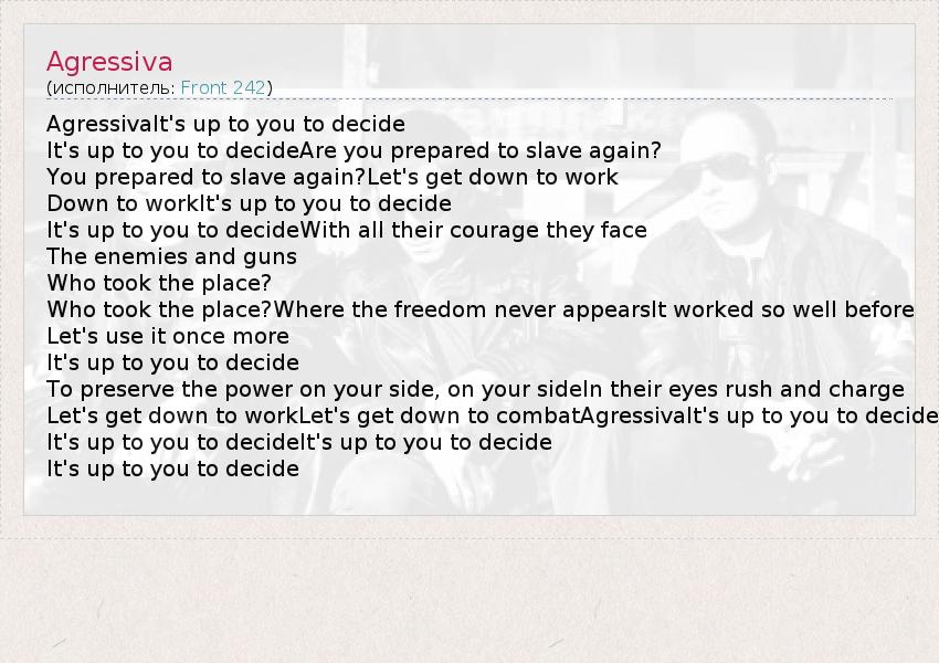 AgressivaIt's up to you to decide It's up to you to decideAre you prepared to slave again? You prepared to slave again?Let's get down to work Down to workIt's up to you to decide It's up to you to decideWith all their courage they face The enemies and guns Who took the place? Who took the place?Where the freedom never appearsIt worked so well before Let's use it once more It's up to you to decide To preserve the power on your side, on your sideIn their eyes rush and charge Let's get down to workLet's get down to combatAgressivaIt's up to you to decide It's up to you to decideIt's up to you to decide It's up to you to decide