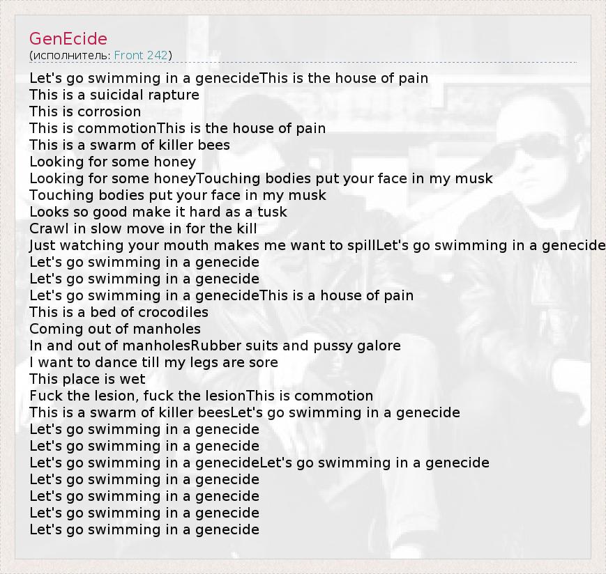 Let's go swimming in a genecideThis is the house of pain This is a suicidal rapture This is corrosion This is commotionThis is the house of pain This is a swarm of killer bees Looking for some honey Looking for some honeyTouching bodies put your face in my musk Touching bodies put your face in my musk Looks so good make it hard as a tusk Crawl in slow move in for the kill Just watching your mouth makes me want to spillLet's go swimming in a genecide Let's go swimming in a genecide Let's go swimming in a genecide Let's go swimming in a genecideThis is a house of pain This is a bed of crocodiles Coming out of manholes In and out of manholesRubber suits and pussy galore I want to dance till my legs are sore This place is wet Fuck the lesion, fuck the lesionThis is commotion This is a swarm of killer beesLet's go swimming in a genecide Let's go swimming in a genecide Let's go swimming in a genecide Let's go swimming in a genecideLet's go swimming in a genecide Let's go swimming in a genecide Let's go swimming in a genecide Let's go swimming in a genecide Let's go swimming in a genecide