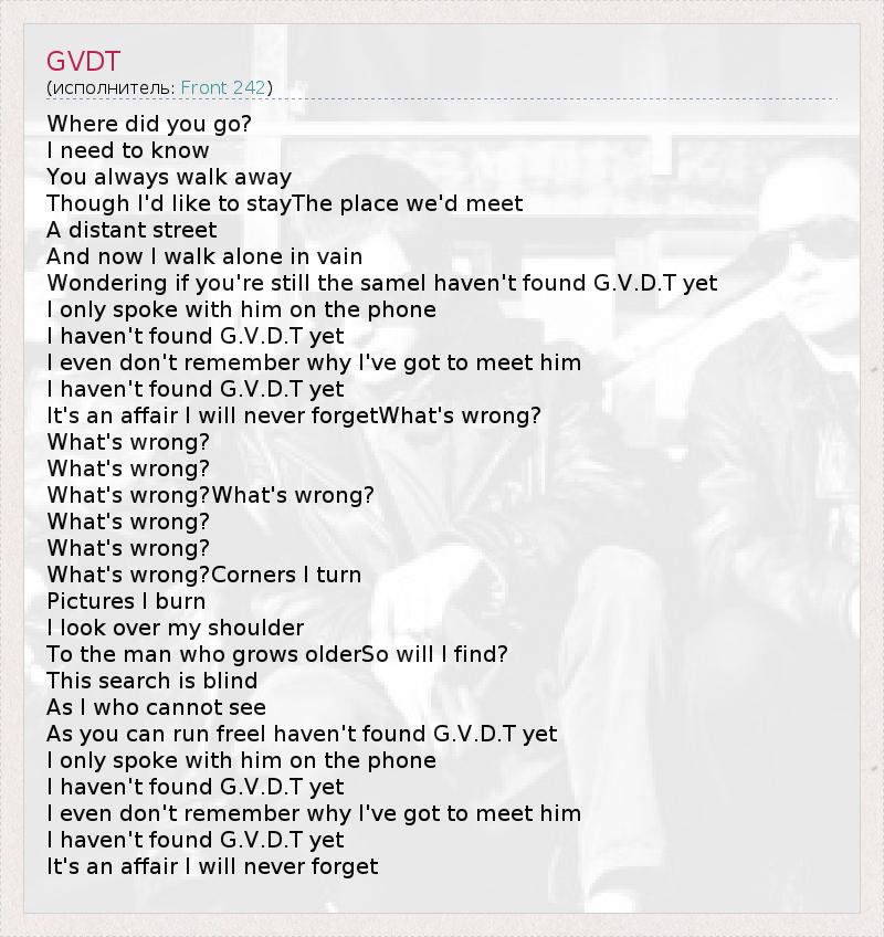 Where did you go? I need to know You always walk away Though I'd like to stayThe place we'd meet A distant street And now I walk alone in vain Wondering if you're still the sameI haven't found G.V.D.T yet I only spoke with him on the phone I haven't found G.V.D.T yet I even don't remember why I've got to meet him I haven't found G.V.D.T yet It's an affair I will never forgetWhat's wrong? What's wrong? What's wrong? What's wrong?What's wrong? What's wrong? What's wrong? What's wrong?Corners I turn Pictures I burn I look over my shoulder To the man who grows olderSo will I find? This search is blind As I who cannot see As you can run freeI haven't found G.V.D.T yet I only spoke with him on the phone I haven't found G.V.D.T yet I even don't remember why I've got to meet him I haven't found G.V.D.T yet It's an affair I will never forget