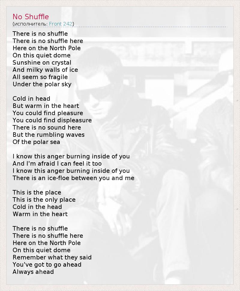 There is no shuffle There is no shuffle here Here on the North Pole On this quiet dome Sunshine on crystal And milky walls of ice All seem so fragile Under the polar sky Cold in head But warm in the heart You could find pleasure You could find displeasure There is no sound here But the rumbling waves Of the polar sea I know this anger burning inside of you And I'm afraid I can feel it too I know this anger burning inside of you There is an ice-floe between you and me This is the place This is the only place Cold in the head Warm in the heart There is no shuffle There is no shuffle here Here on the North Pole On this quiet dome Remember what they said You've got to go ahead Always ahead