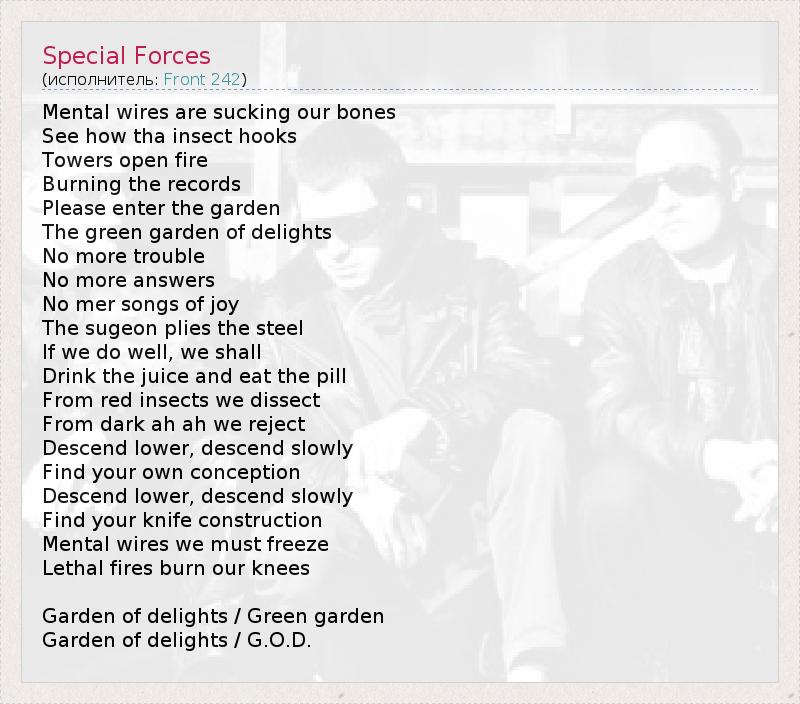 Mental wires are sucking our bones See how tha insect hooks Towers open fire Burning the records Please enter the garden The green garden of delights No more trouble No more answers No mer songs of joy The sugeon plies the steel If we do well, we shall Drink the juice and eat the pill From red insects we dissect From dark ah ah we reject Descend lower, descend slowly Find your own conception Descend lower, descend slowly Find your knife construction Mental wires we must freeze Lethal fires burn our knees Garden of delights / Green garden Garden of delights / G.O.D.