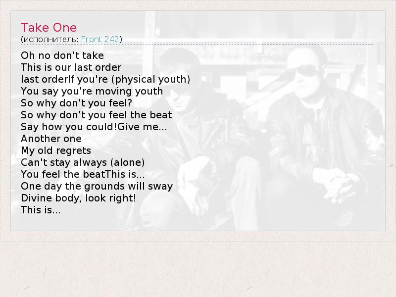 Это интересно:Бельгийская команда "Front 242" является одним из пионеров жанра EBM. Ее история началась в 1981 году, когда на почве общих интересов в электронной музыке и графическом дизайне Даниэль Брессанутти и Дирк Берген образовали дуэт "Prothese". Название вскоре было заменено на "Front 242", и к концу года под этим именем вышел сингл "Principles".Примерно в то же время появился еще один дуэт,... продолжение