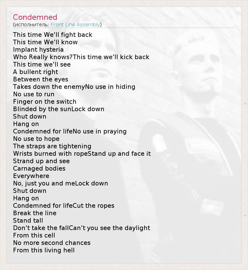 This time We'll fight back This time We'll know Implant hysteria Who Really knows?This time we'll kick back This time we'll see A bullent right Between the eyes Takes down the enemyNo use in hiding No use to run Finger on the switch Blinded by the sunLock down Shut down Hang on Condemned for lifeNo use in praying No use to hope The straps are tightening Wrists burned with ropeStand up and face it Strand up and see Carnaged bodies Everywhere No, just you and meLock down Shut down Hang on Condemned for lifeCut the ropes Break the line Stand tall Don't take the fallCan't you see the daylight From this cell No more second chances From this living hell