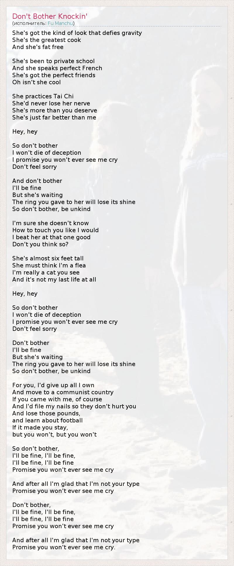 А как ты думаешь, о чем песня "Don't Bother Knockin'" ?