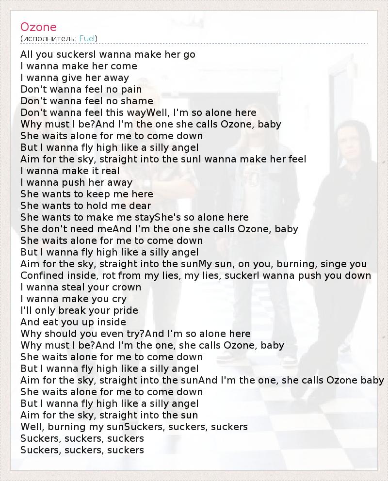 All you suckersI wanna make her go I wanna make her come I wanna give her away Don't wanna feel no pain Don't wanna feel no shame Don't wanna feel this wayWell, I'm so alone here Why must I be?And I'm the one she calls Ozone, baby She waits alone for me to come down But I wanna fly high like a silly angel Aim for the sky, straight into the sunI wanna make her feel I wanna make it real I wanna push her away She wants to keep me here She wants to hold me dear She wants to make me stayShe's so alone here She don't need meAnd I'm the one she calls Ozone, baby She waits alone for me to come down But I wanna fly high like a silly angel Aim for the sky, straight into the sunMy sun, on you, burning, singe you Confined inside, rot from my lies, my lies, suckerI wanna push you down I wanna steal your crown I wanna make you cry I'll only break your pride And eat you up inside Why should you even try?And I'm so alone here Why must I be?And I'm the one, she calls Ozone, baby She waits alone for me to come down But I wanna fly high like a silly angel Aim for the sky, straight into the sunAnd I'm the one, she calls Ozone baby She waits alone for me to come down But I wanna fly high like a silly angel Aim for the sky, straight into the sun Well, burning my sunSuckers, suckers, suckers Suckers, suckers, suckers Suckers, suckers, suckers