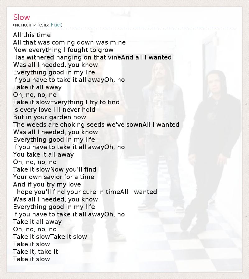 All this time All that was coming down was mine Now everything I fought to grow Has withered hanging on that vineAnd all I wanted Was all I needed, you know Everything good in my life If you have to take it all awayOh, no Take it all away Oh, no, no, no Take it slowEverything I try to find Is every love I'll never hold But in your garden now The weeds are choking seeds we've sownAll I wanted Was all I needed, you know Everything good in my life If you have to take it all awayOh, no You take it all away Oh, no, no, no Take it slowNow you'll find Your own savior for a time And if you try my love I hope you'll find your cure in timeAll I wanted Was all I needed, you know Everything good in my life If you have to take it all awayOh, no Take it all away Oh, no, no, no Take it slowTake it slow Take it slow Take it, take it Take it slow