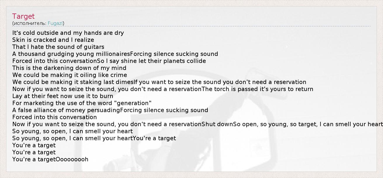 Это интересно:Группа была образована в 1987 году в городе Вашингтон, США. Её основателем является крестный отец Straight Edge’а и по совместительству владелец лейбла Dischord - Ян МакКей (Ian MacKaye). Для Яна это была не первая группа, до Fugazi он играл в The Teen Idles, Egg Hunt, Minor Threat, Skewbald и Embrace.... продолжение