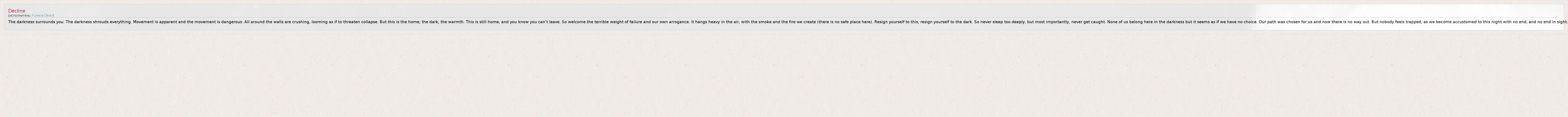 The darkness surrounds you. The darkness shrouds everything. Movement is apparent and the movement is dangerous. All around the walls are crushing, looming as if to threaten collapse. But this is the home, the dark, the warmth. This is still home, and you know you can't leave. So welcome the terrible weight of failure and our own arrogance. It hangs heavy in the air, with the smoke and the fire we create (there is no safe place here). Resign yourself to this, resign yourself to the dark. So never sleep too deeply, but most importantly, never get caught. None of us belong here in the darkness but it seems as if we have no choice. Our path was chosen for us and now there is no way out. But nobody feels trapped, as we become accustomed to this night with no end, and no end in sight.