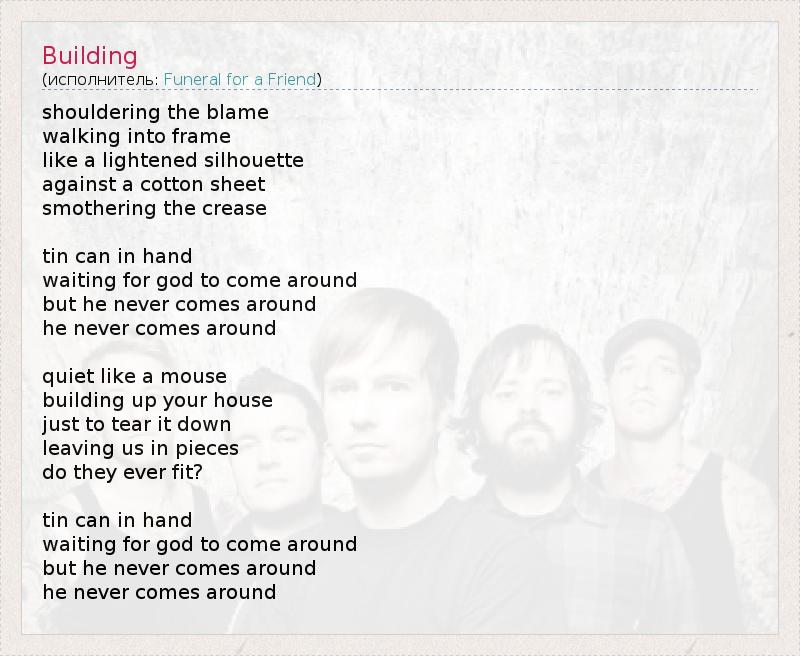 Это интересно:История Funeral for a Friend берёт начало в декабре 2001 года в городке Бридженд на юге Уэльса, когда ребята из местной молодёжной группы January Thirst пригласили Мэтта Дэвиса на роль второго вокалиста. Преданный поклонник стиля панк заметно разнообразил звучание группы, которая до его прихода играла только агрессивный метал."Моей мечтой всегда была возможность играть в группе, способной... продолжение