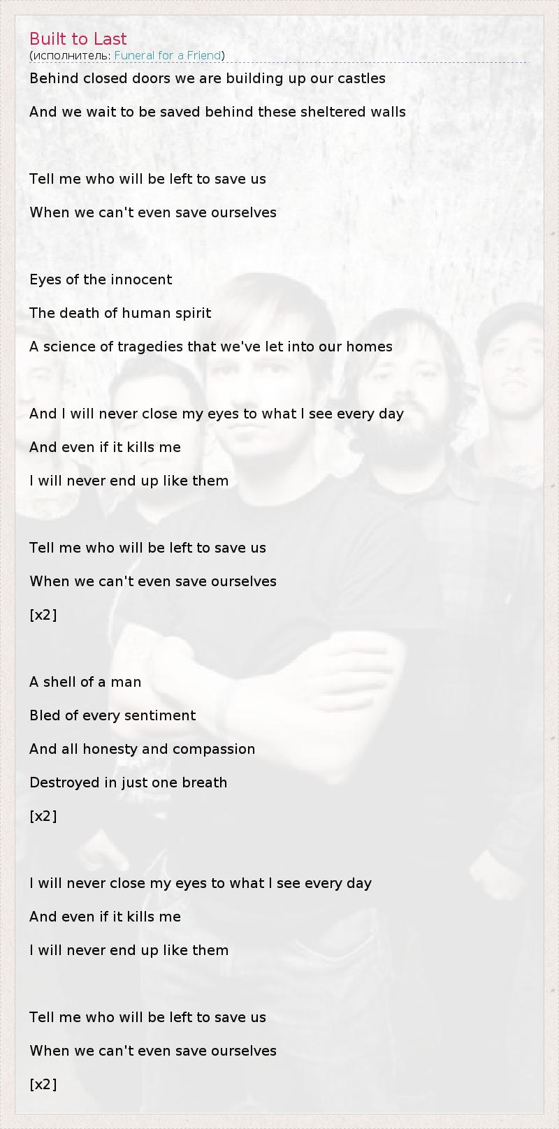 Это интересно:История Funeral for a Friend берёт начало в декабре 2001 года в городке Бридженд на юге Уэльса, когда ребята из местной молодёжной группы January Thirst пригласили Мэтта Дэвиса на роль второго вокалиста. Преданный поклонник стиля панк заметно разнообразил звучание группы, которая до его прихода играла только агрессивный метал."Моей мечтой всегда была возможность играть в группе, способной... продолжение