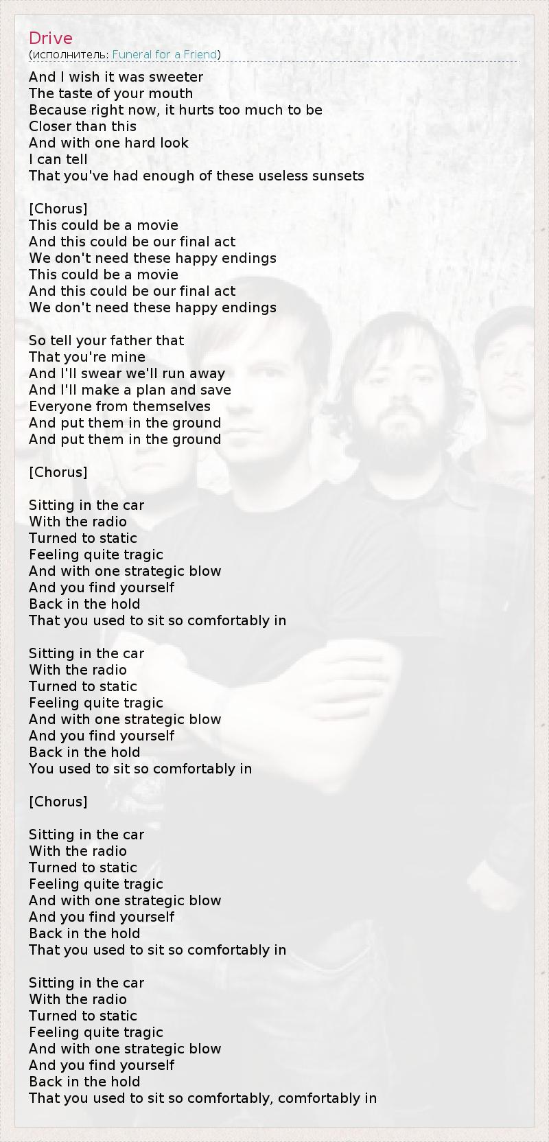 And I wish it was sweeter The taste of your mouth Because right now, it hurts too much to be Closer than this And with one hard look I can tell That you've had enough of these useless sunsets [Chorus] This could be a movie And this could be our final act We don't need these happy endings This could be a movie And this could be our final act We don't need these happy endings So tell your father that That you're mine And I'll swear we'll run away And I'll make a plan and save Everyone from themselves And put them in the ground And put them in the ground [Chorus] Sitting in the car With the radio Turned to static Feeling quite tragic And with one strategic blow And you find yourself Back in the hold That you used to sit so comfortably in Sitting in the car With the radio Turned to static Feeling quite tragic And with one strategic blow And you find yourself Back in the hold You used to sit so comfortably in [Chorus] Sitting in the car With the radio Turned to static Feeling quite tragic And with one strategic blow And you find yourself Back in the hold That you used to sit so comfortably in Sitting in the car With the radio Turned to static Feeling quite tragic And with one strategic blow And you find yourself Back in the hold That you used to sit so comfortably, comfortably in